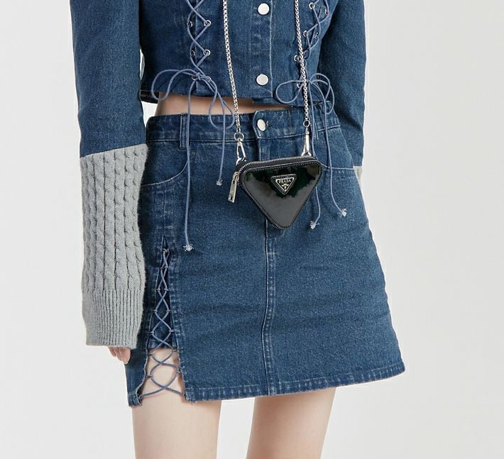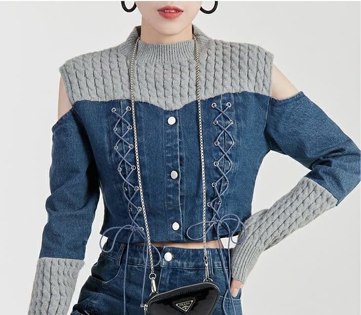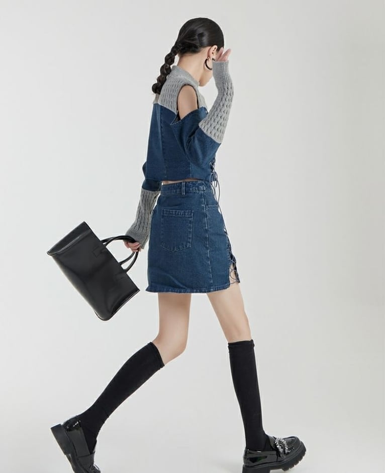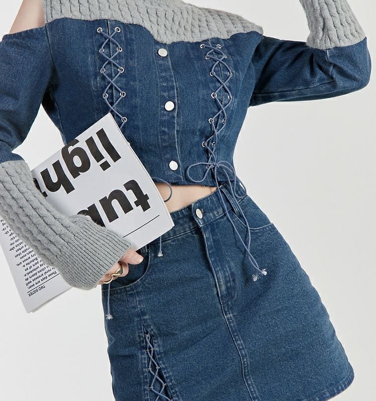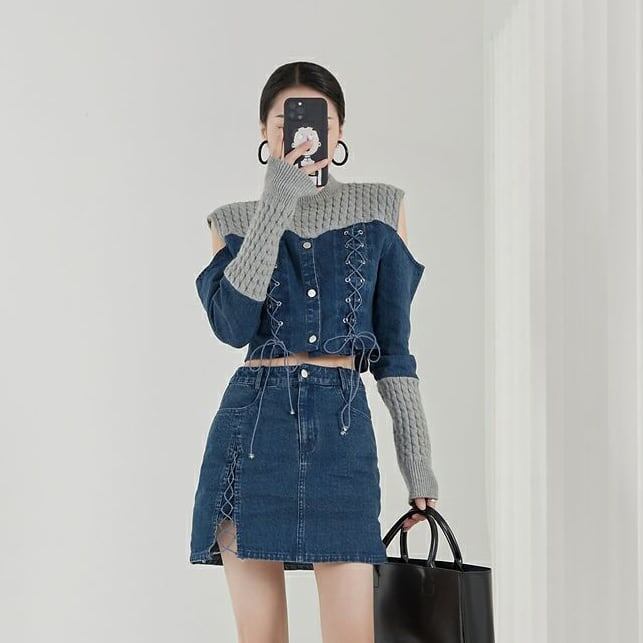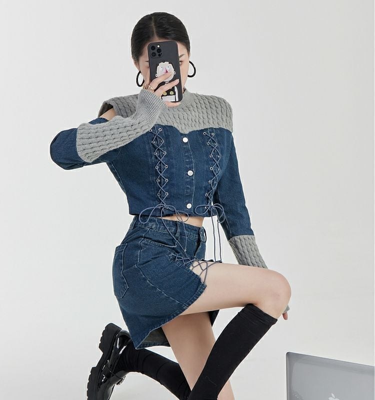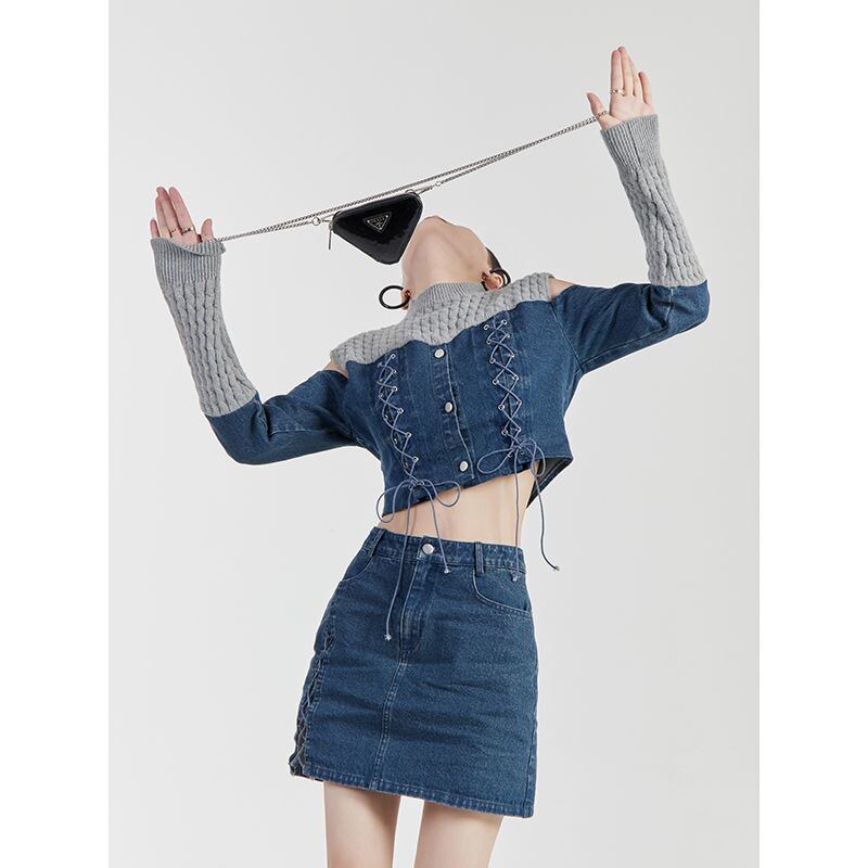 スタイルアップ効果抜群 デニム 高見えデザイン トップスⅹミニスカートセットアップE-9160