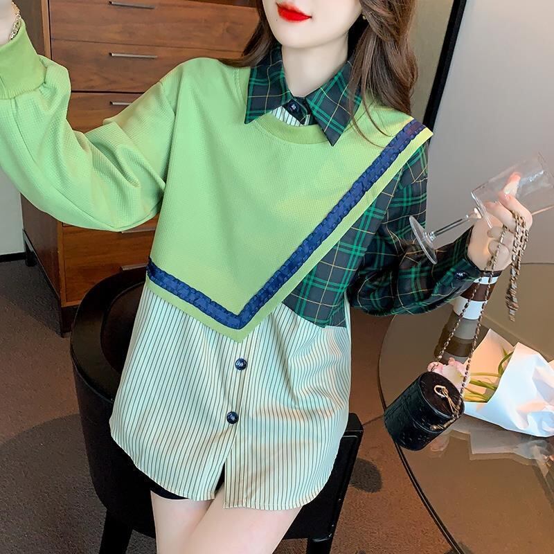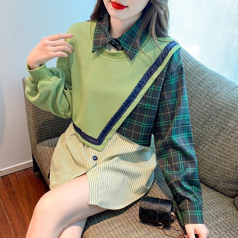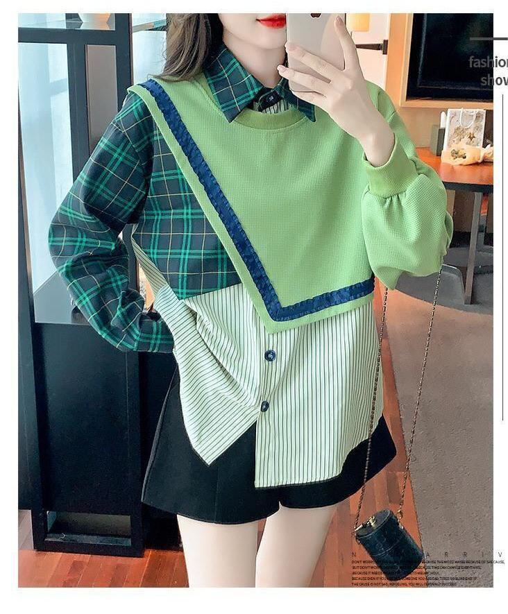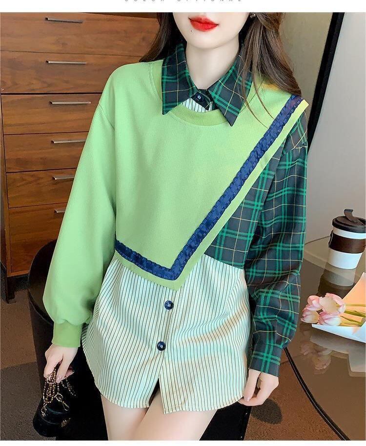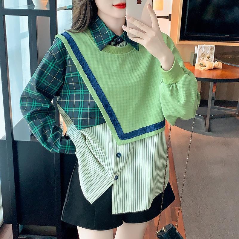 デザイン性抜群 切り替えスウェット レイヤード風 グリーントップスE-4120