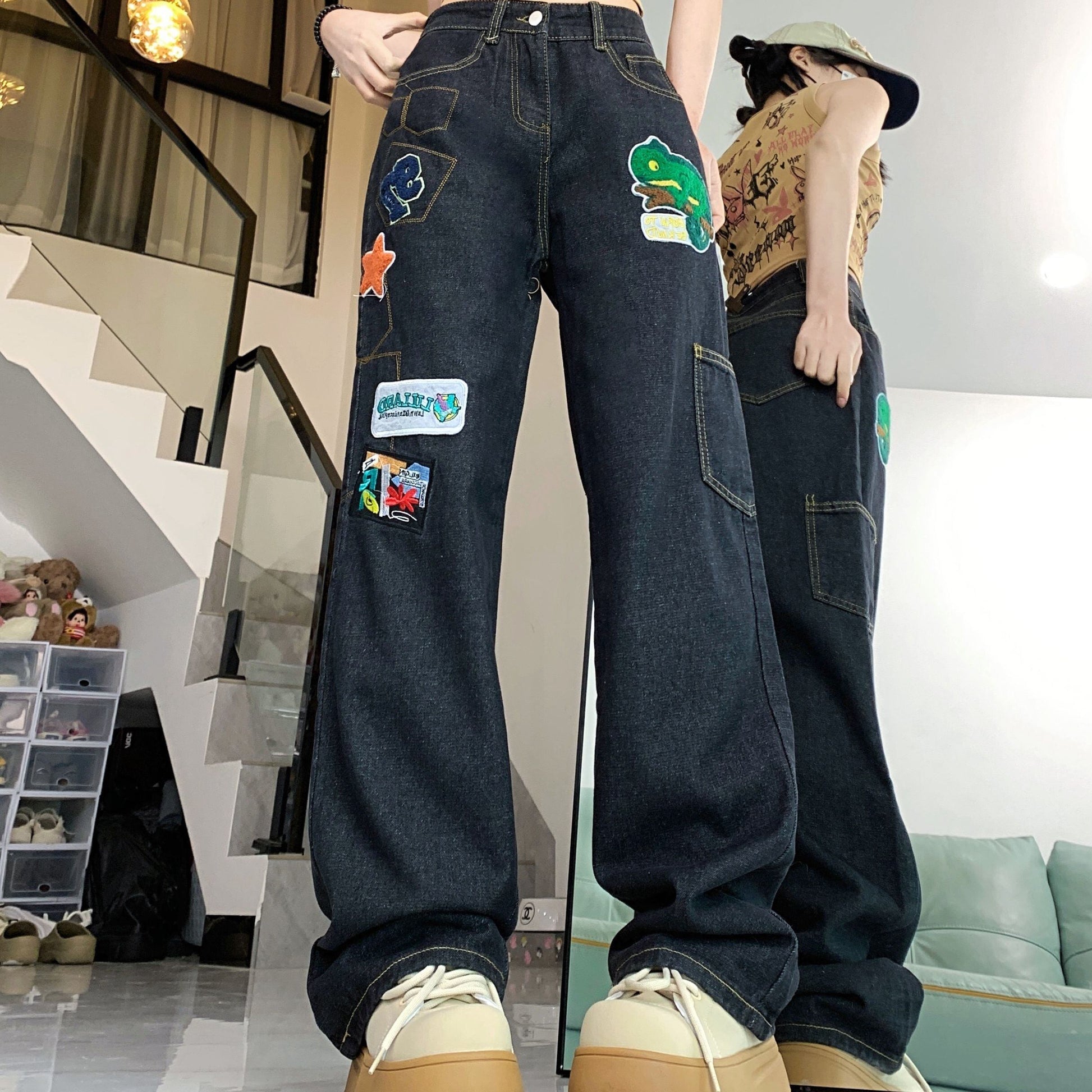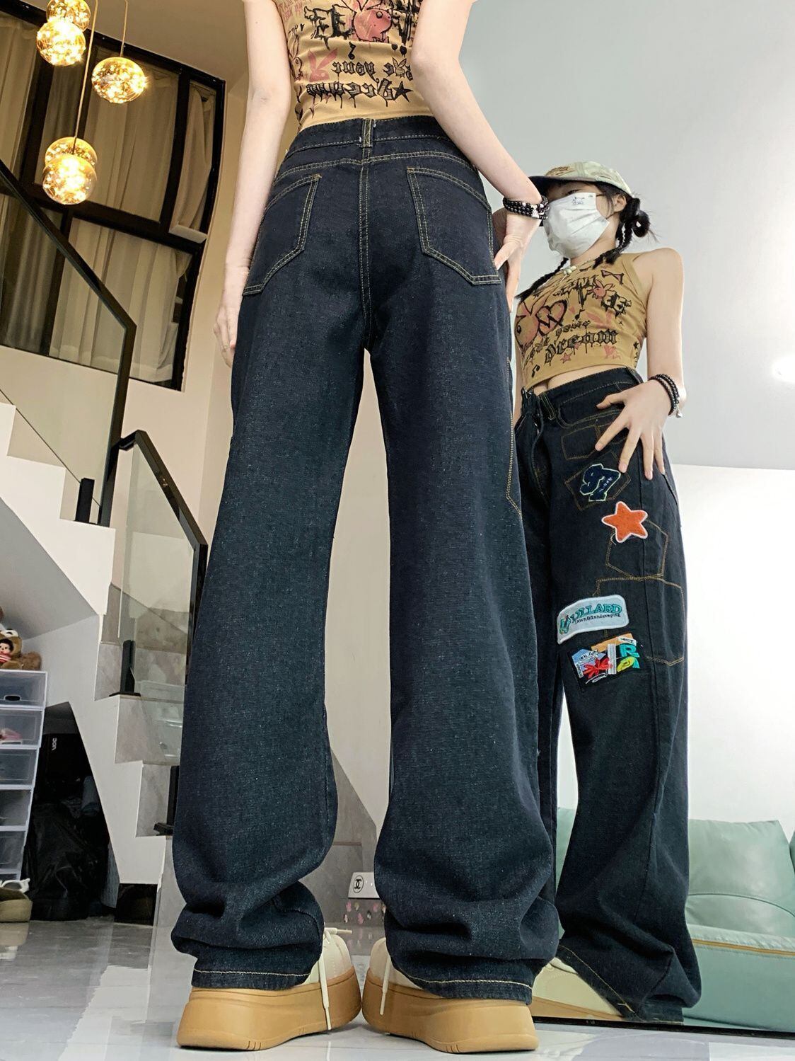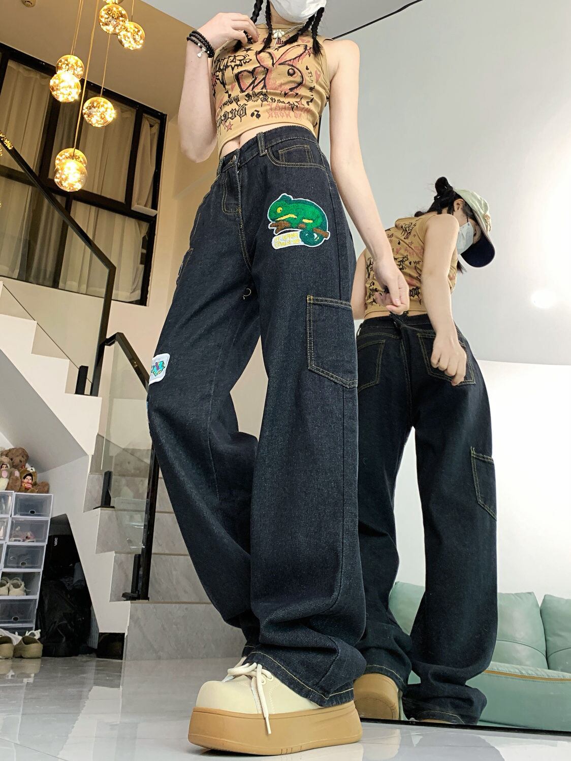 ファッション感満々 着回し力抜群 個性的なデザイン デニム ワイドパンツE-9769
