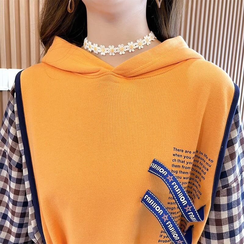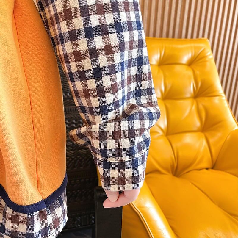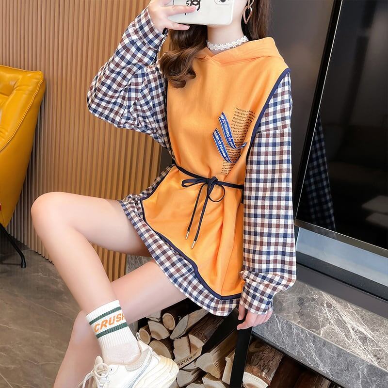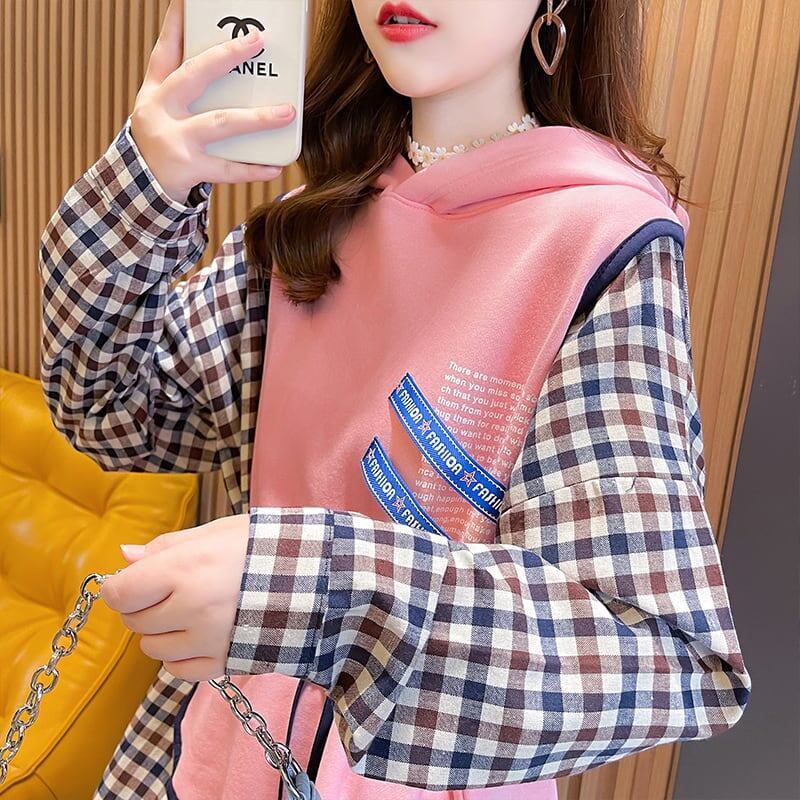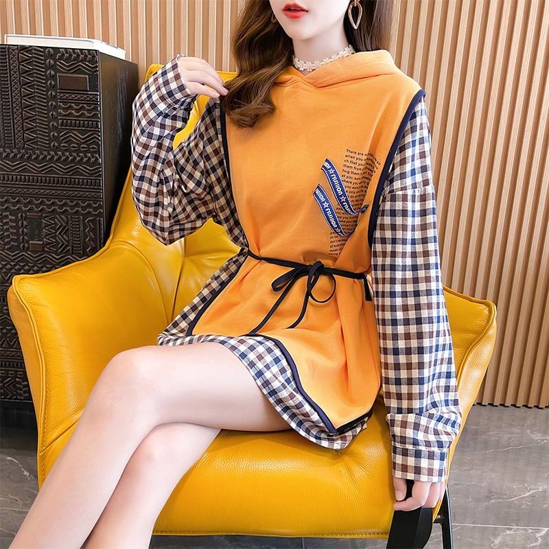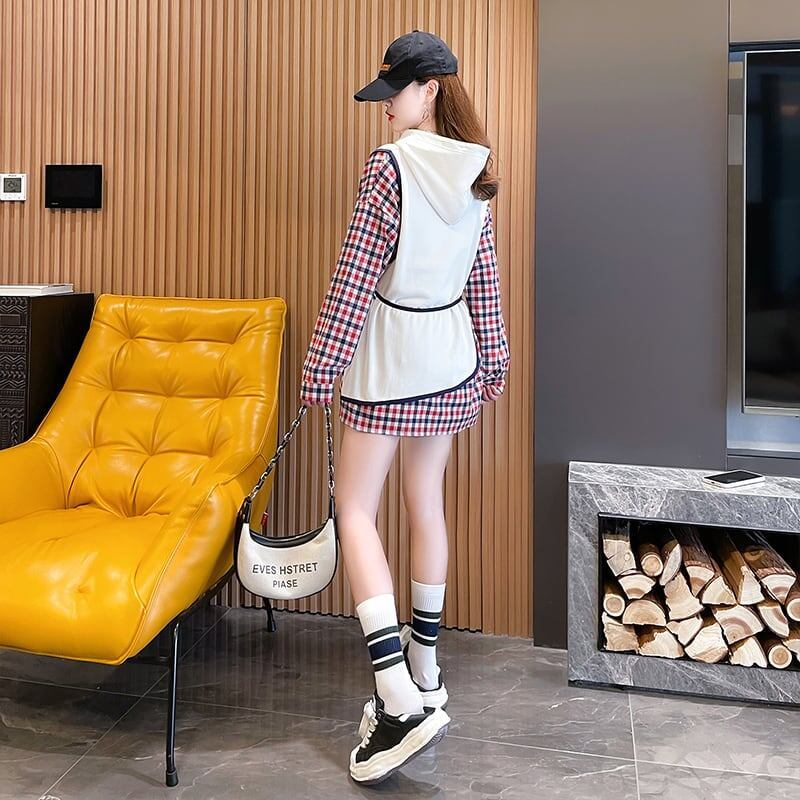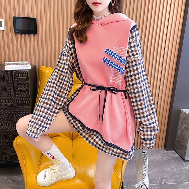 レイヤード風 チェック柄 ロングパーカ全3色トップスE-4803