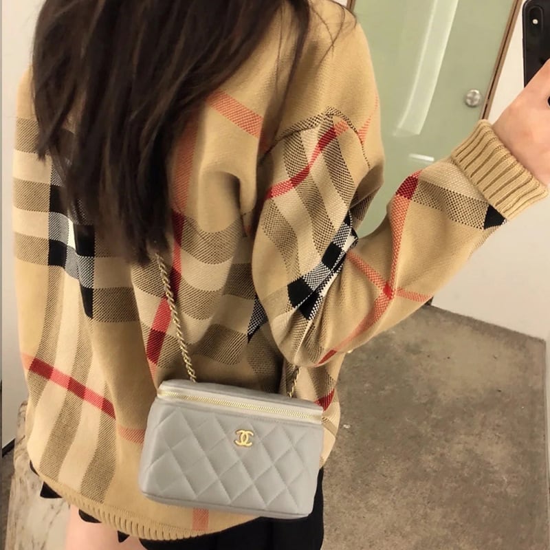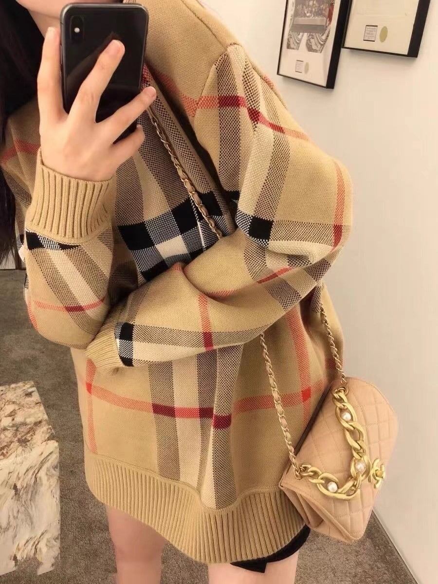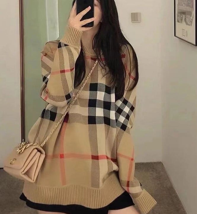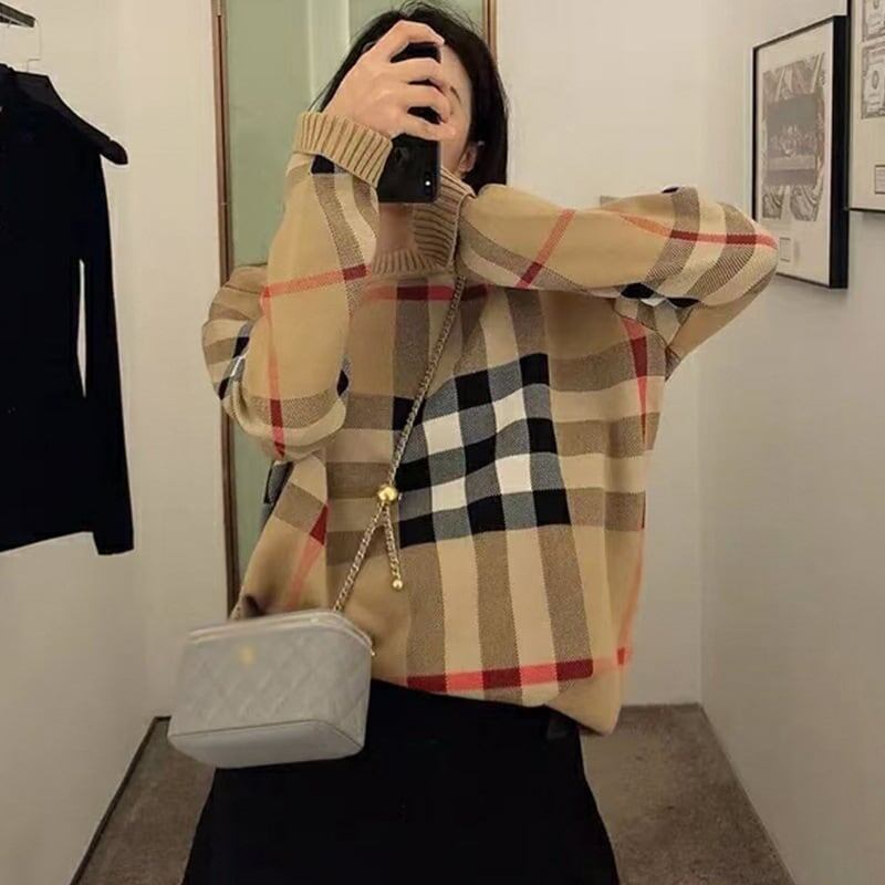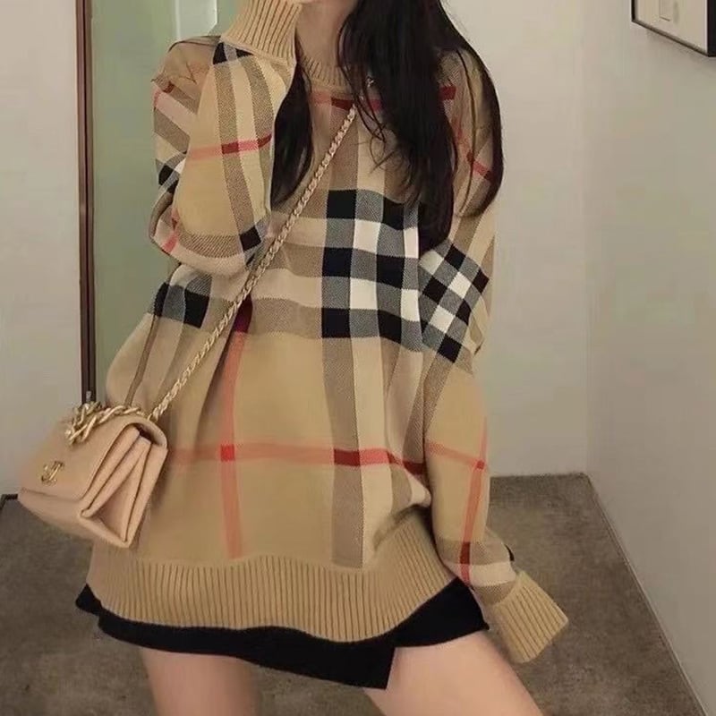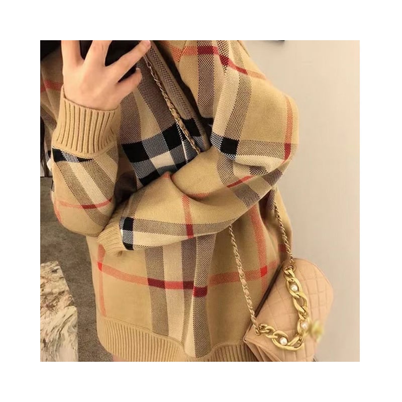 レトロ オシャレ度満点 ラウンドネック チェック柄 長袖 ニット セーターE-2530