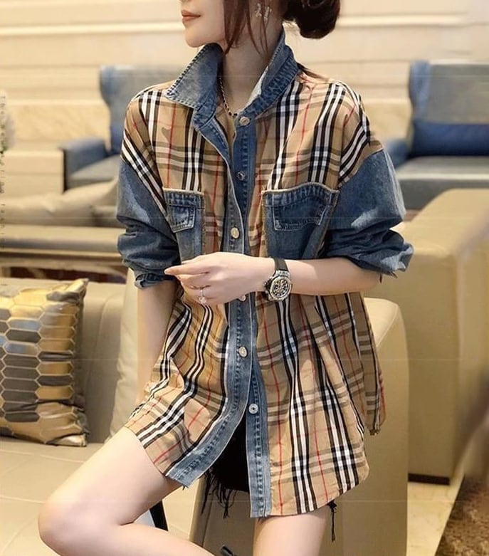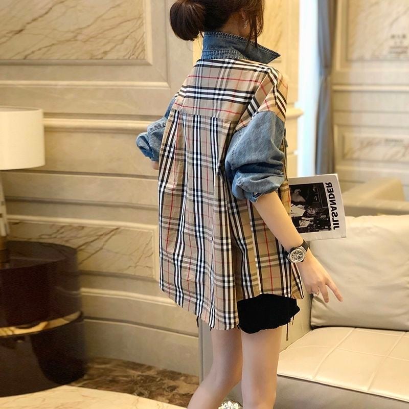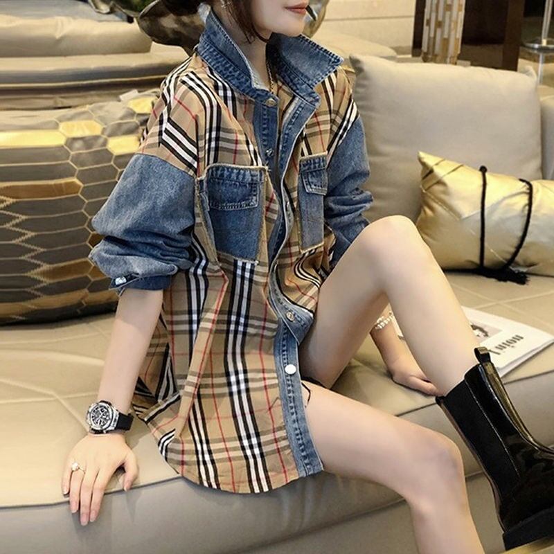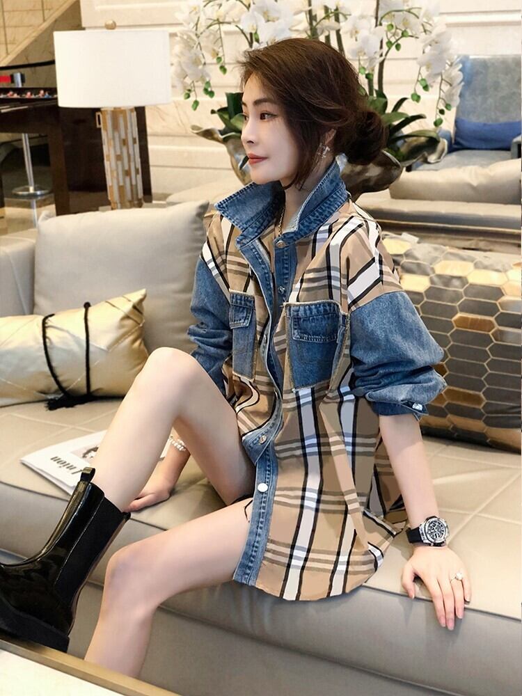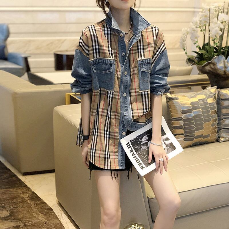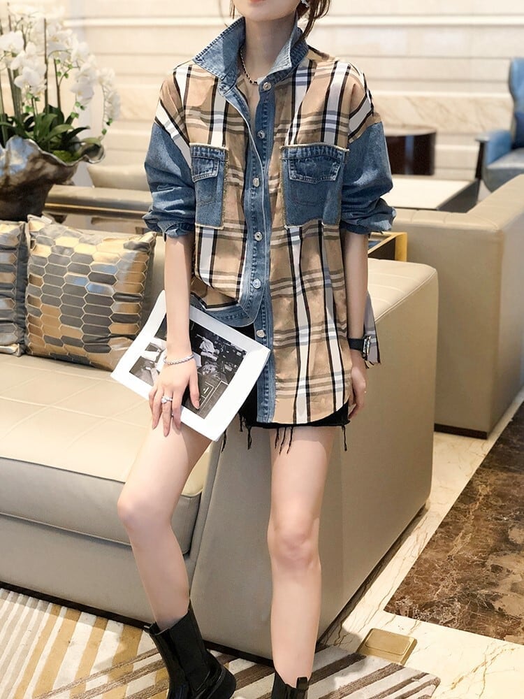 大好評 ファッション 売り切れ必至 チェック柄 切り替え デニム Tシャツ E-9220