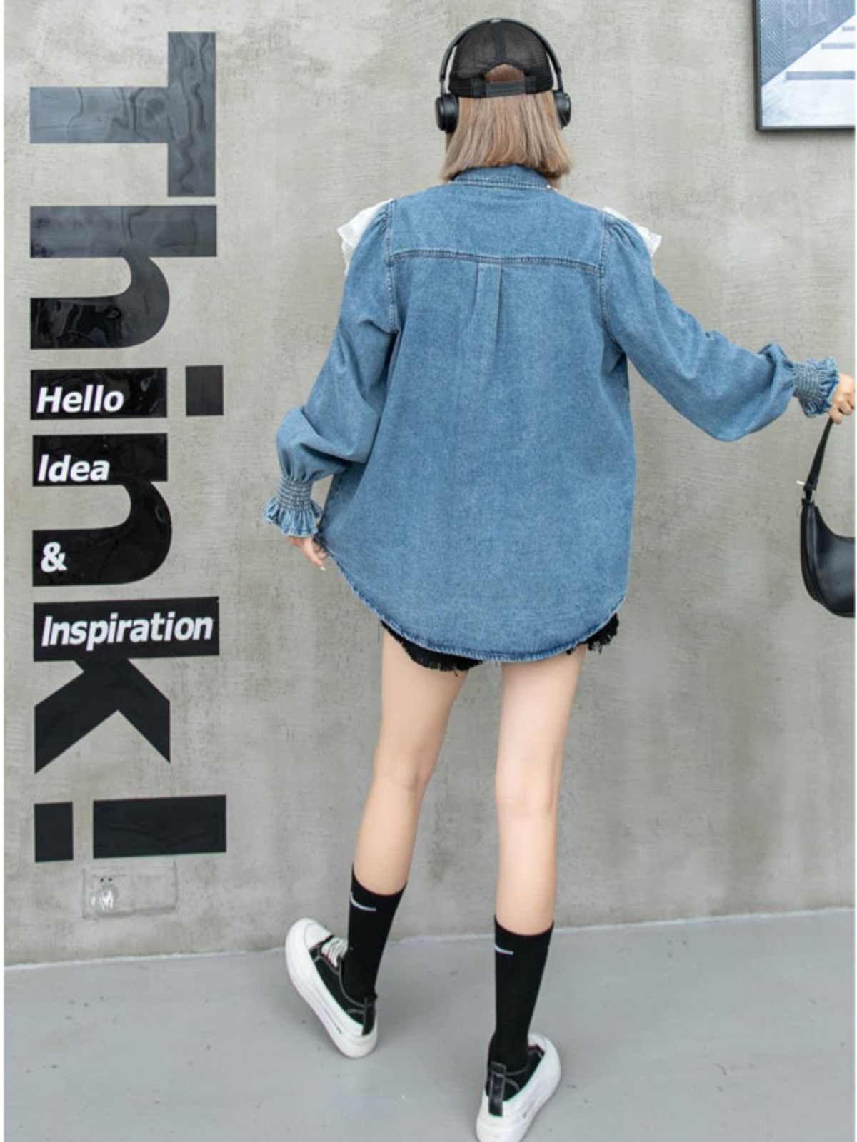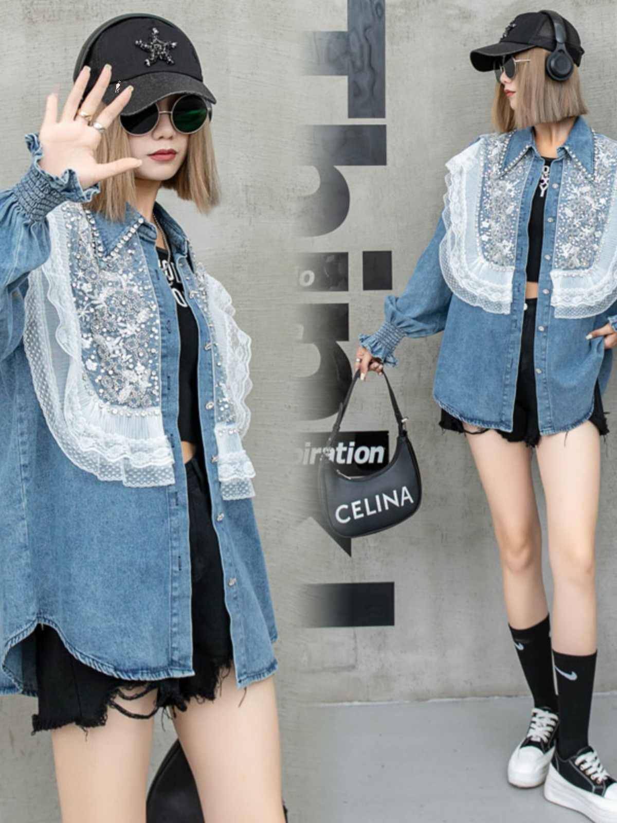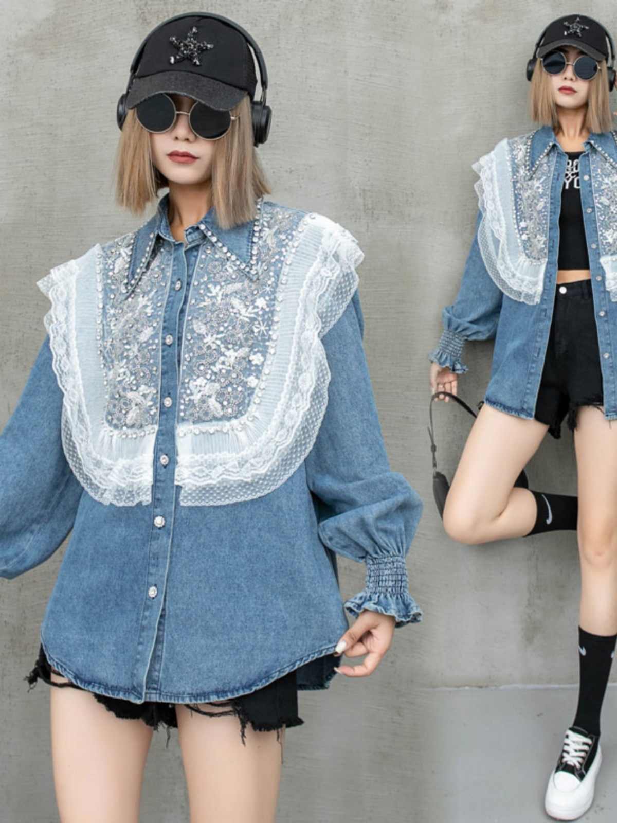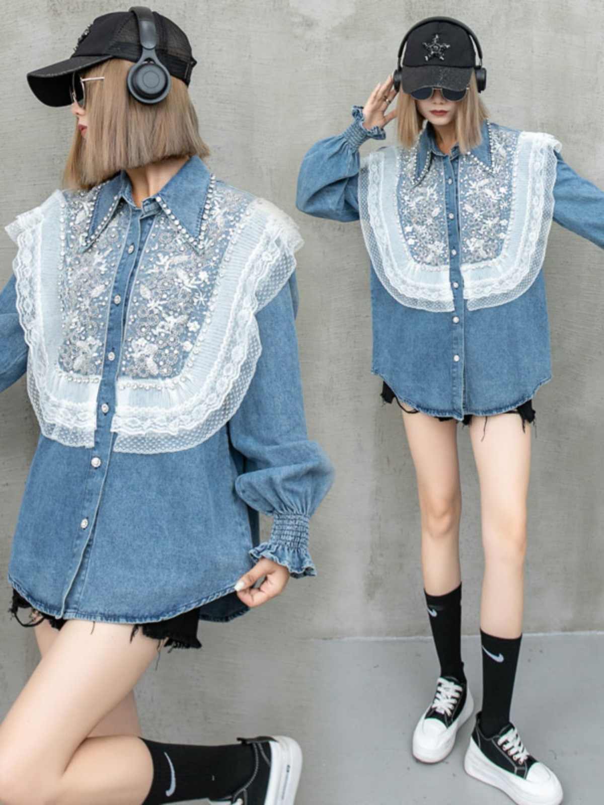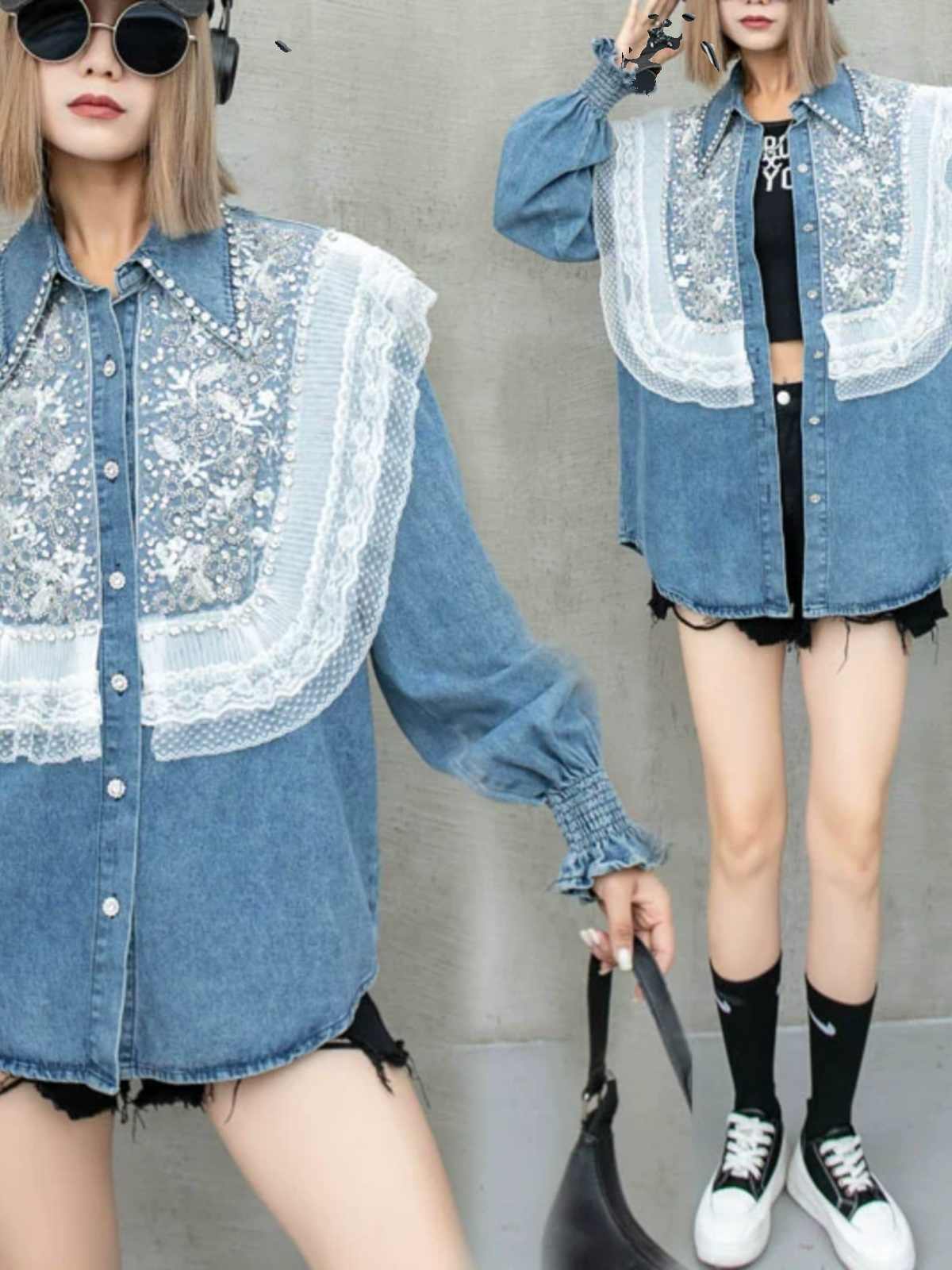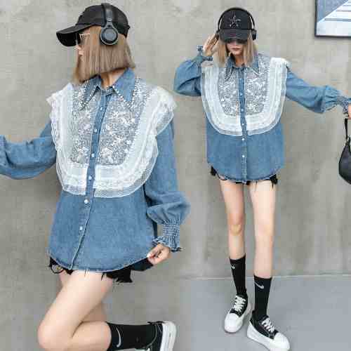 大好評 上質 話題沸騰中 おしゃれ度高め レース 切り替え デニム シャツ E-9409