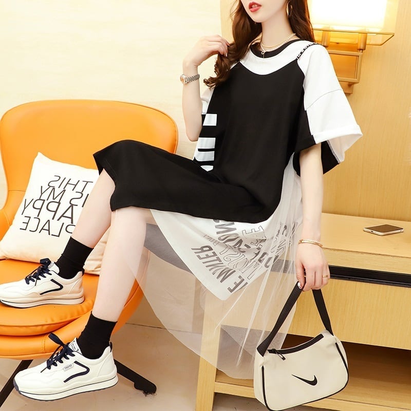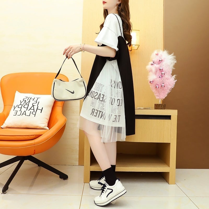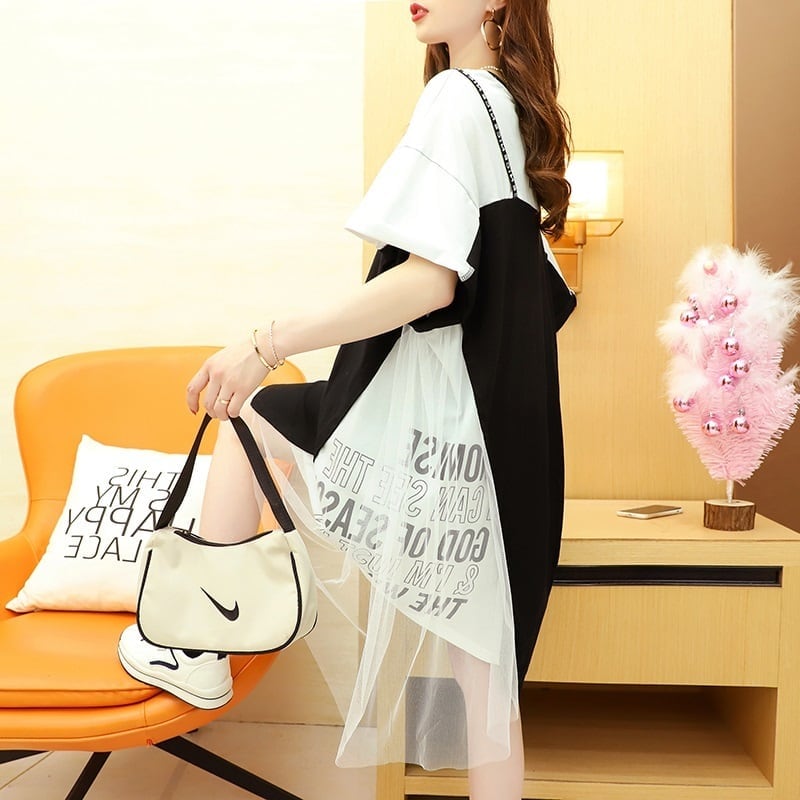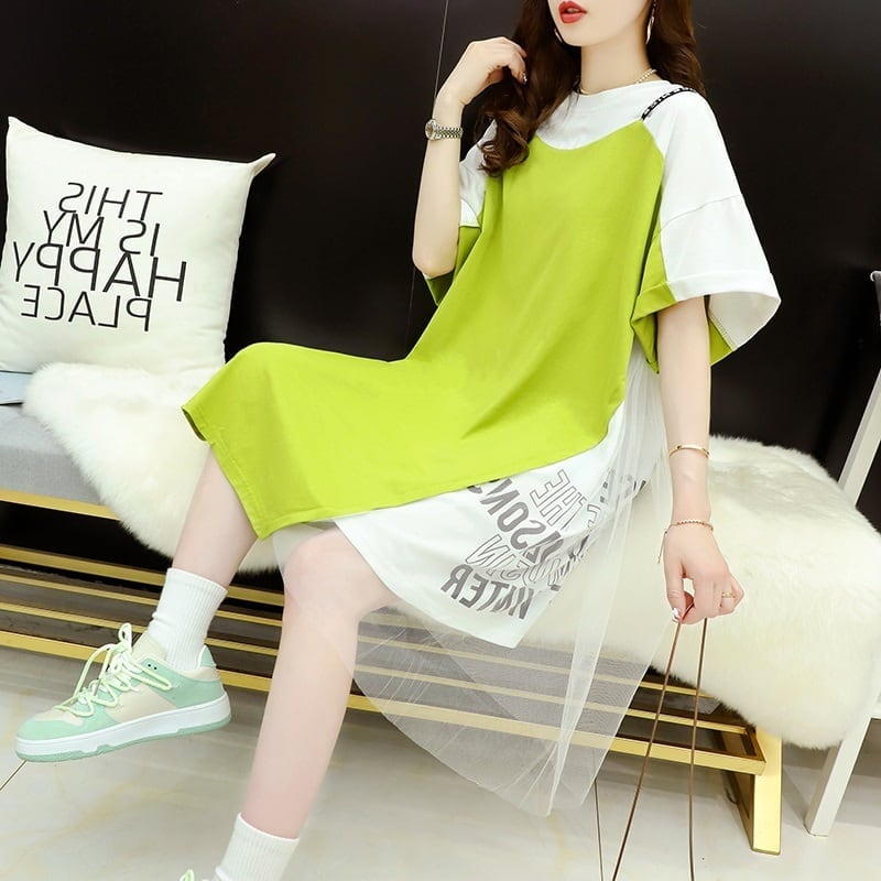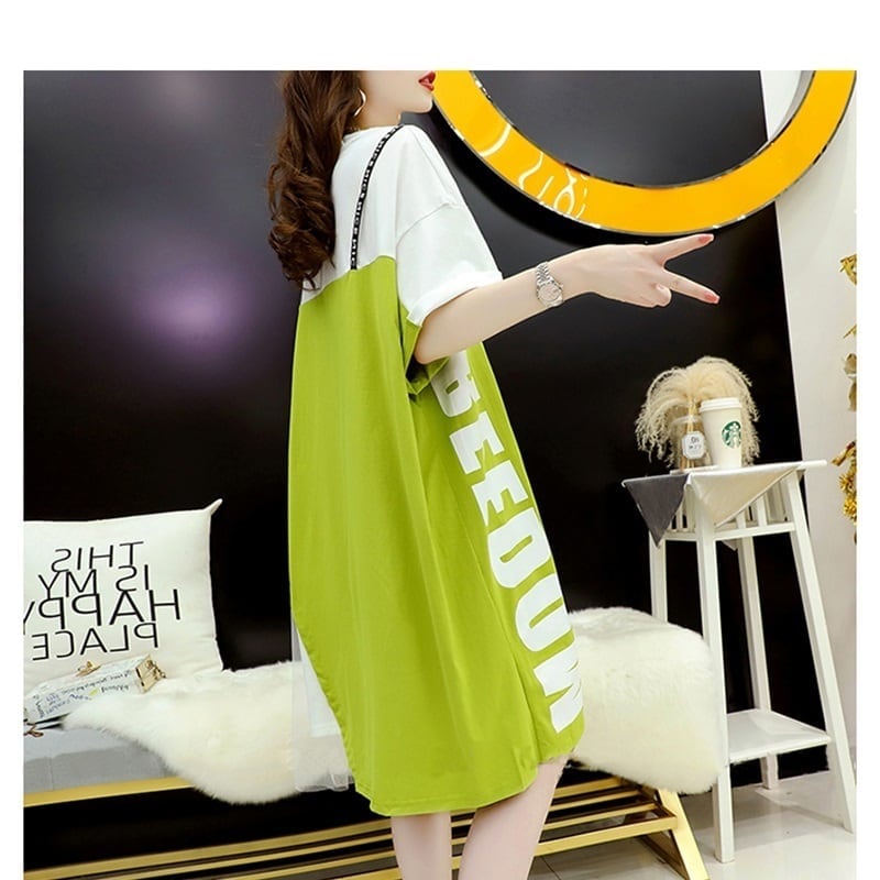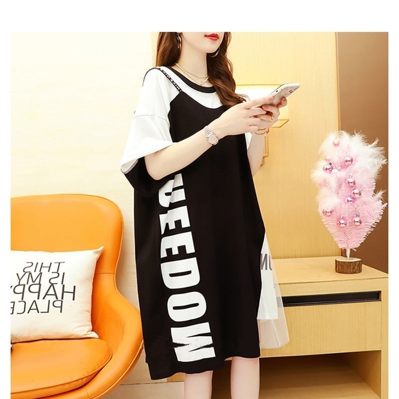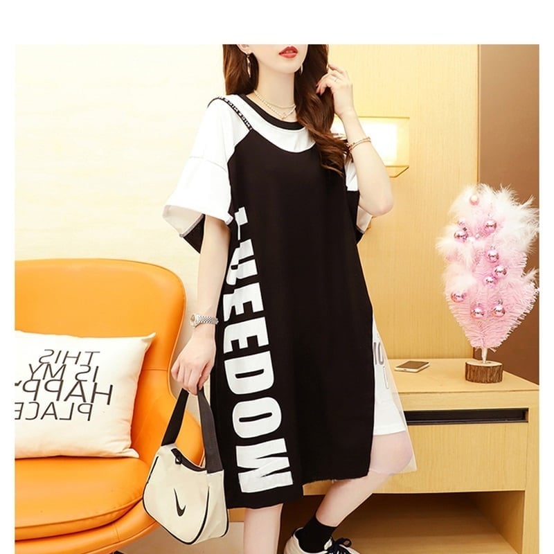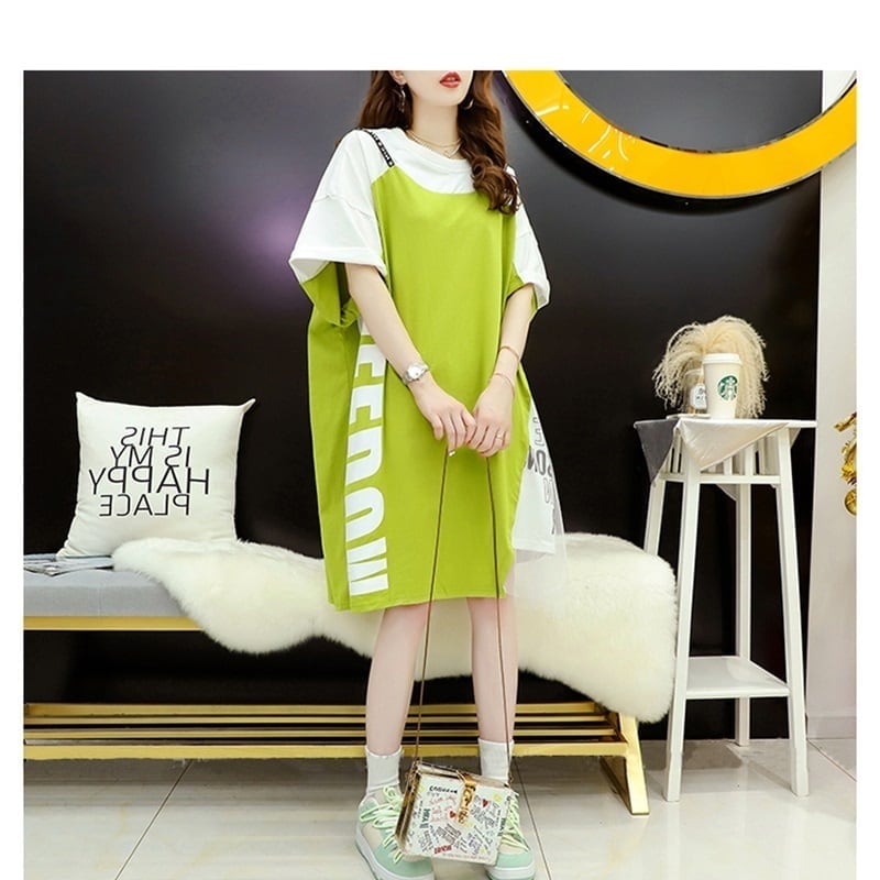 好感度UP 切り替え レイヤード風 プリント Tシャツ ゆったりワンピース<ins-8105>