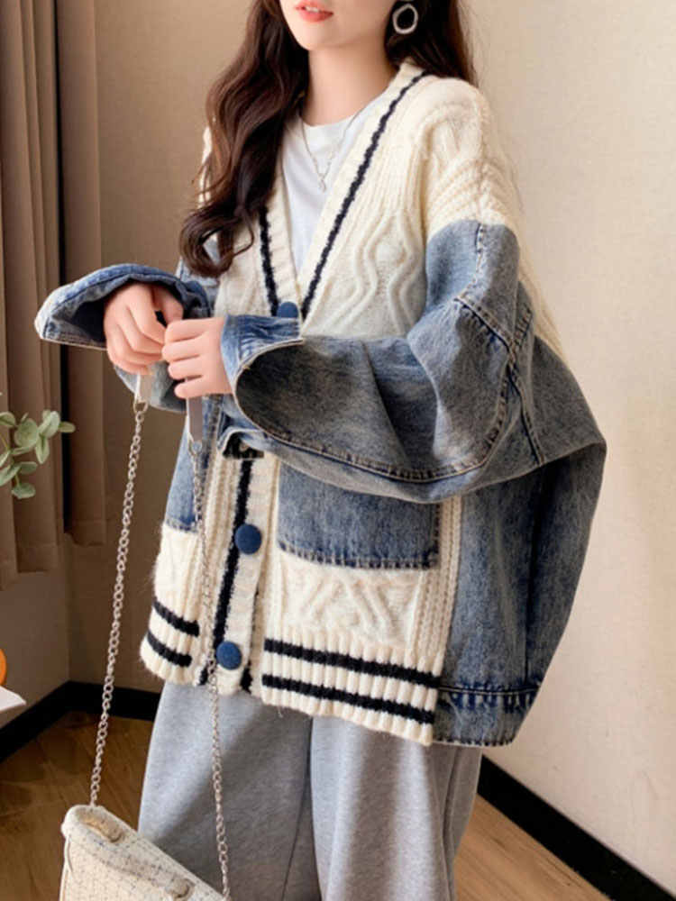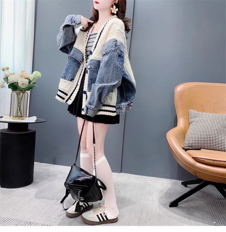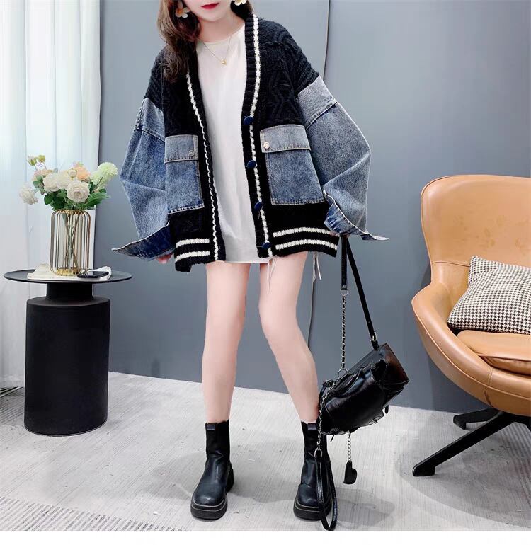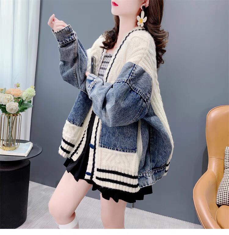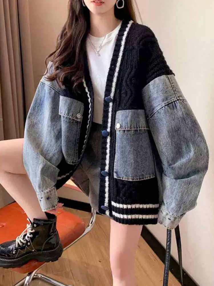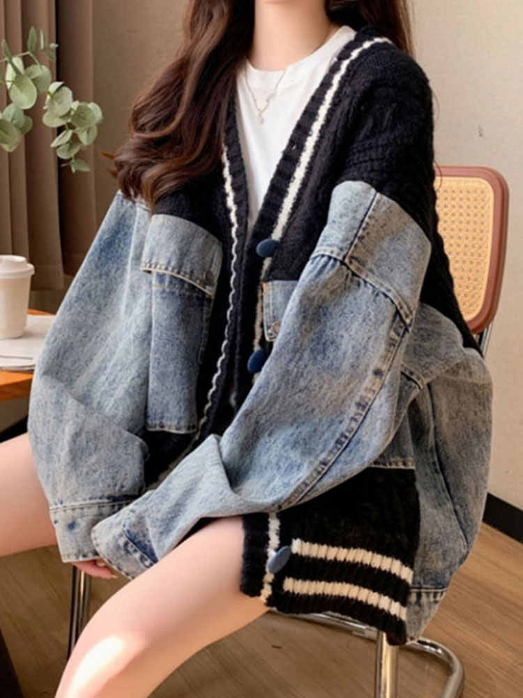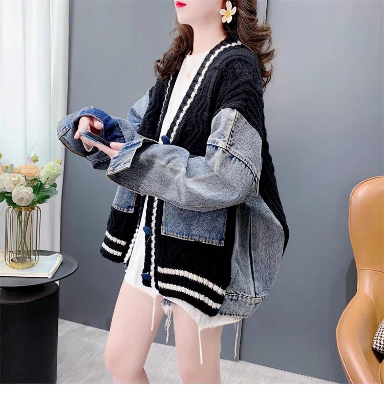 存在感抜群 おしゃれ度高め トレンドアイテム デニム 切り替え 2色選択 ニットトップスE-9724