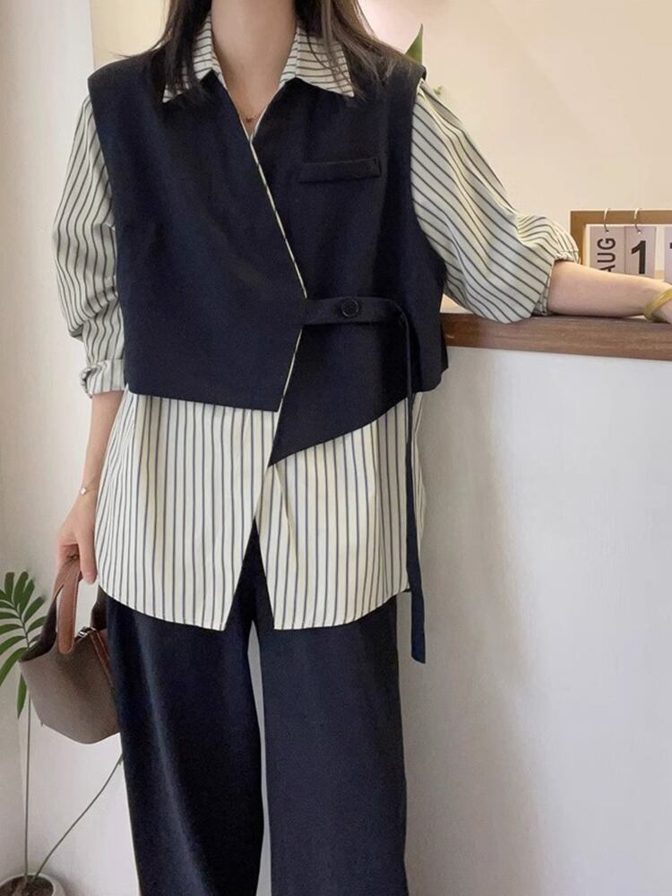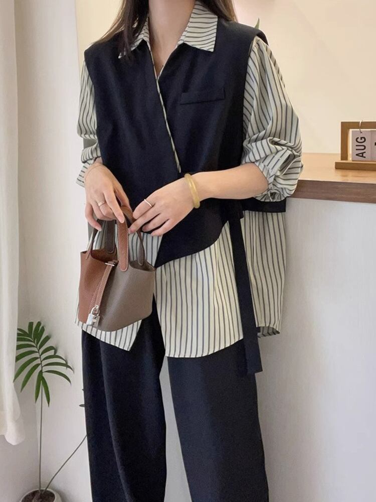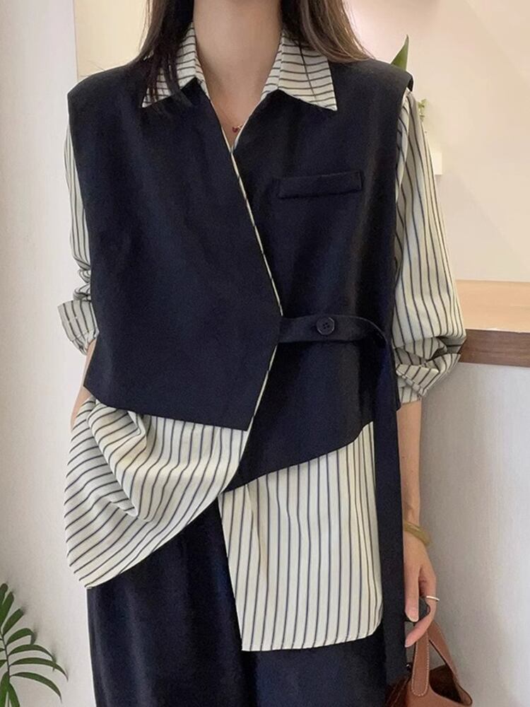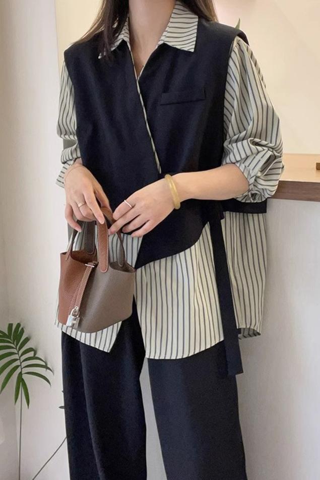 存在感抜群 レイヤード風 トレンドアイテム ストライプ柄 切り替え シャツ E-9555