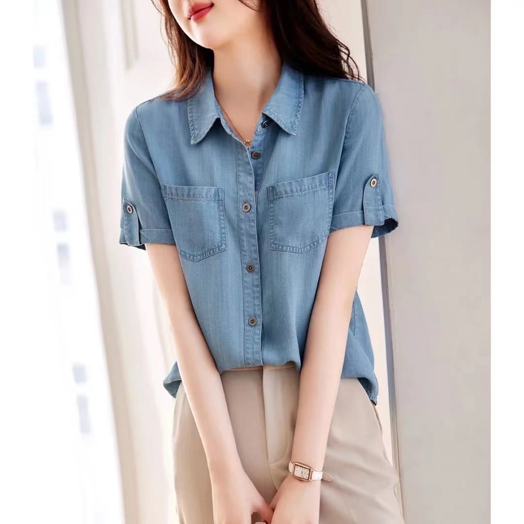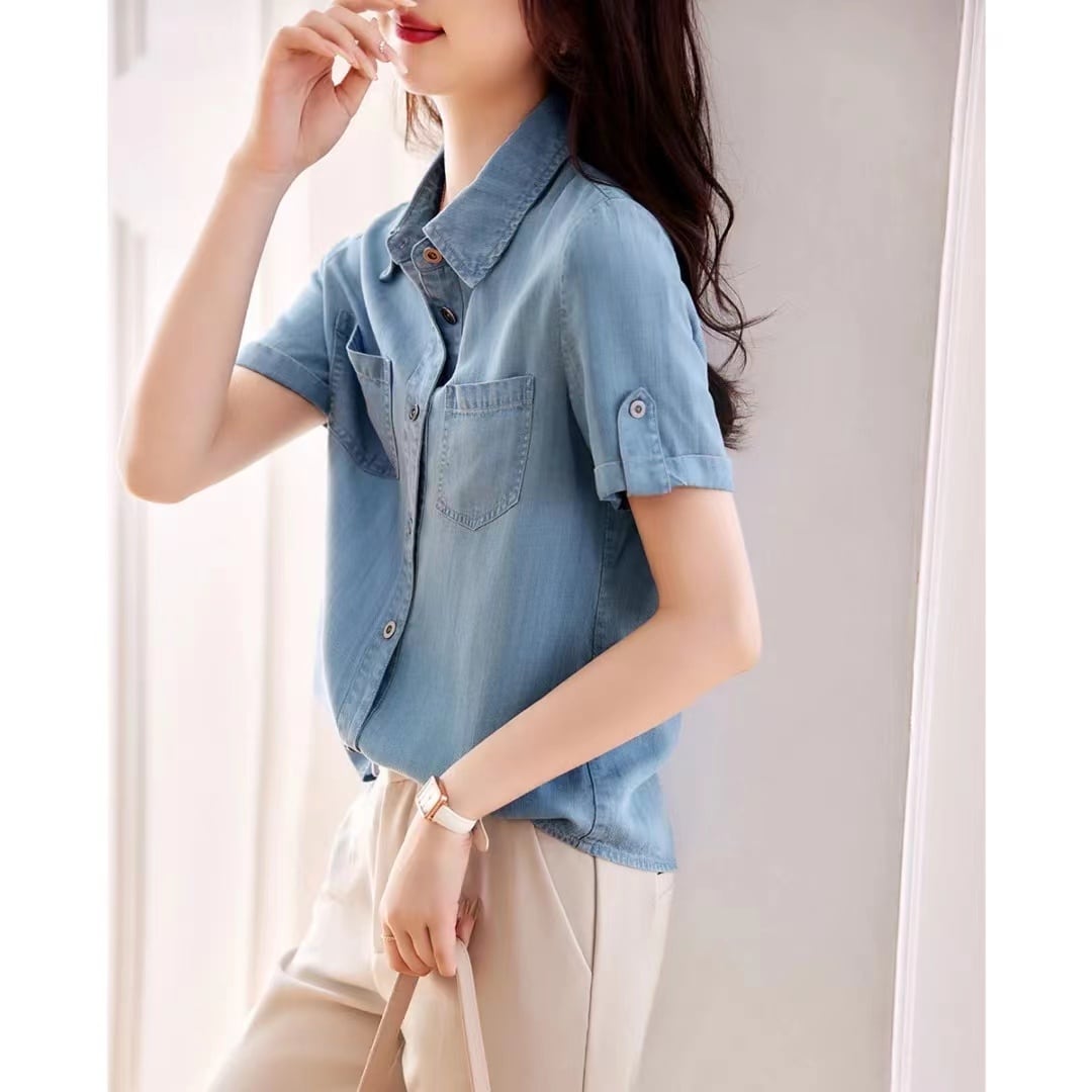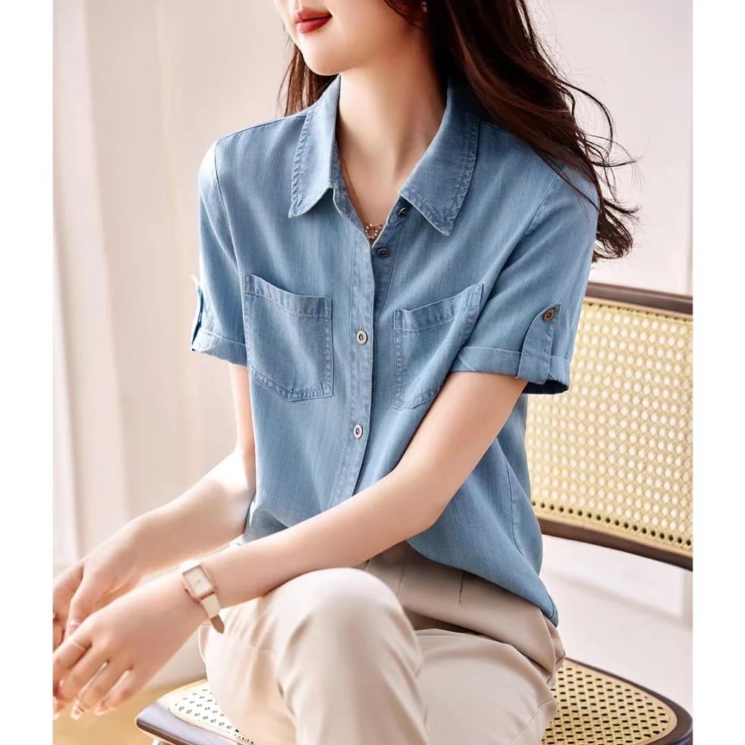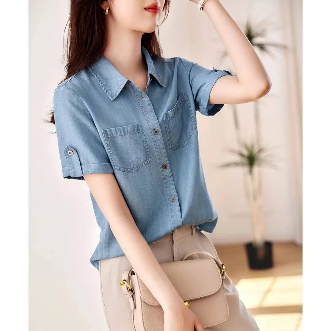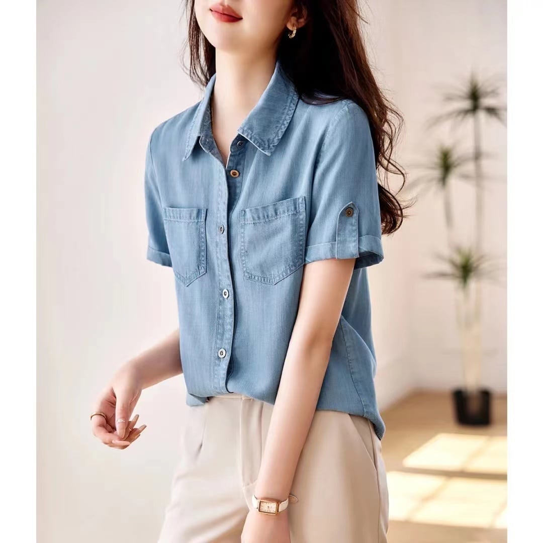 定番シンプル 上質 エレガント デニム 半袖シャツ<ins-8249>