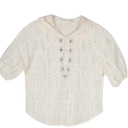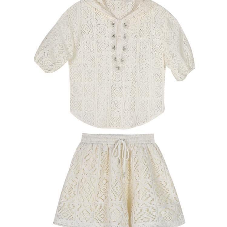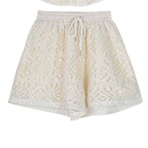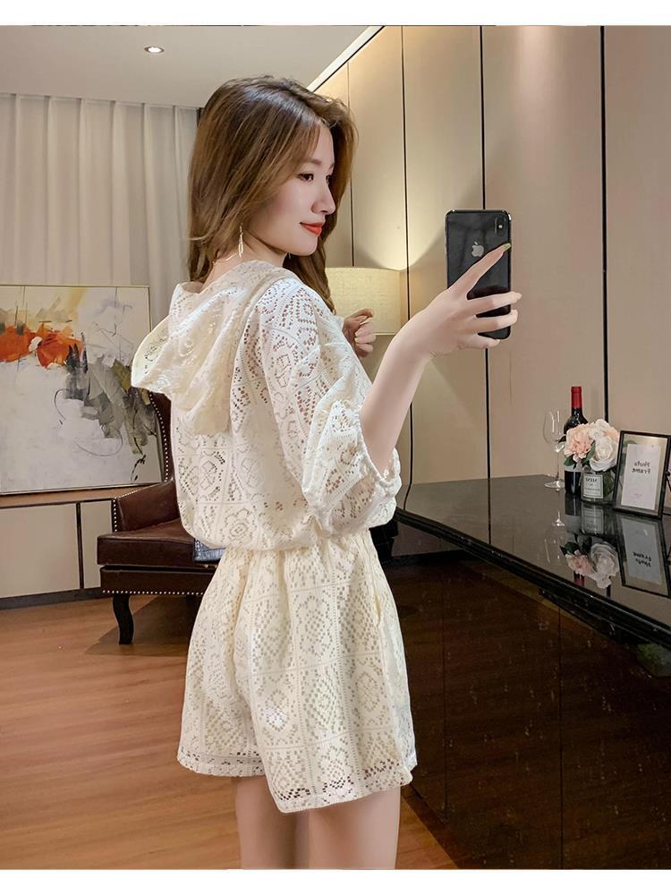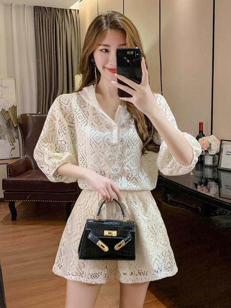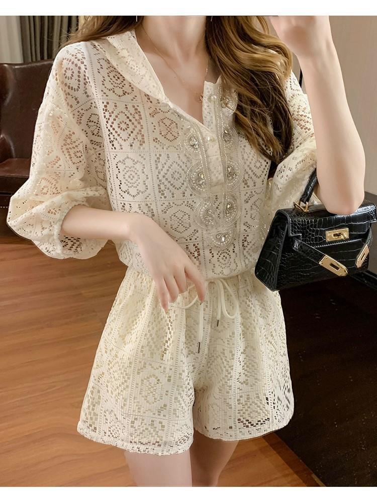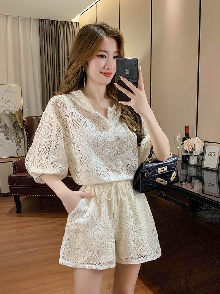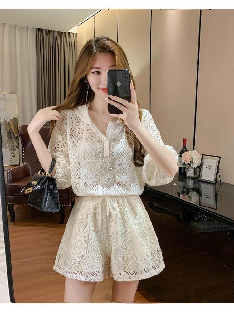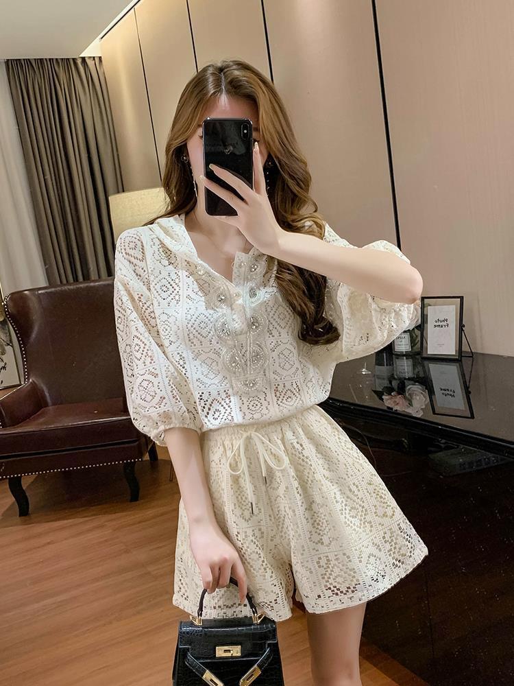 感度UP ファッション レース 透かし彫り カジュアル ブラウスⅹパンツセット<ins-8516>