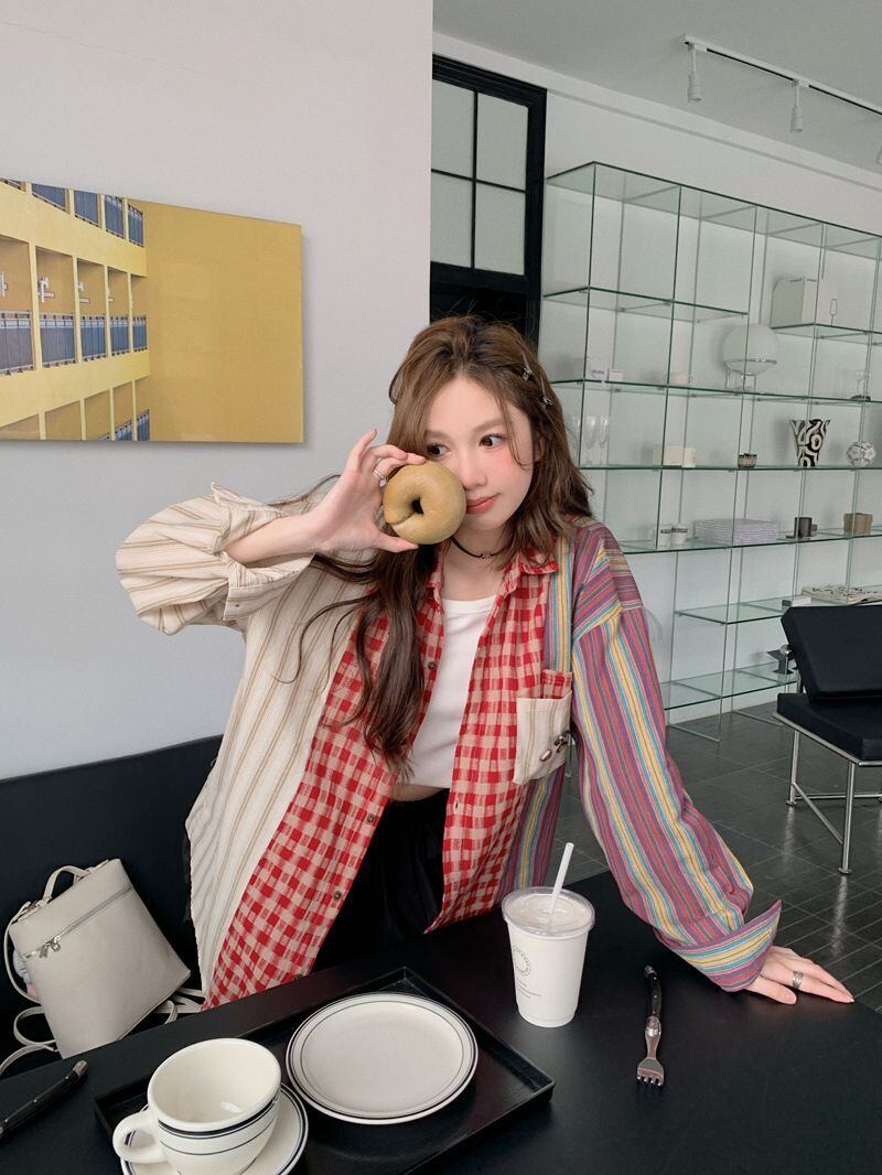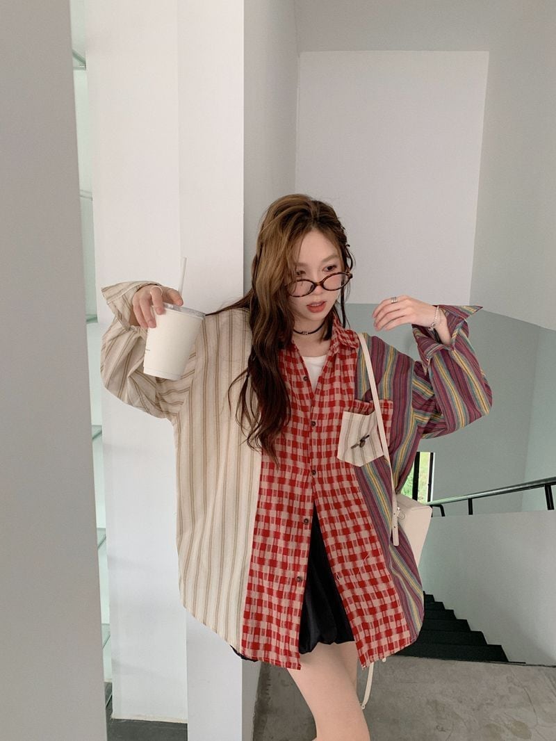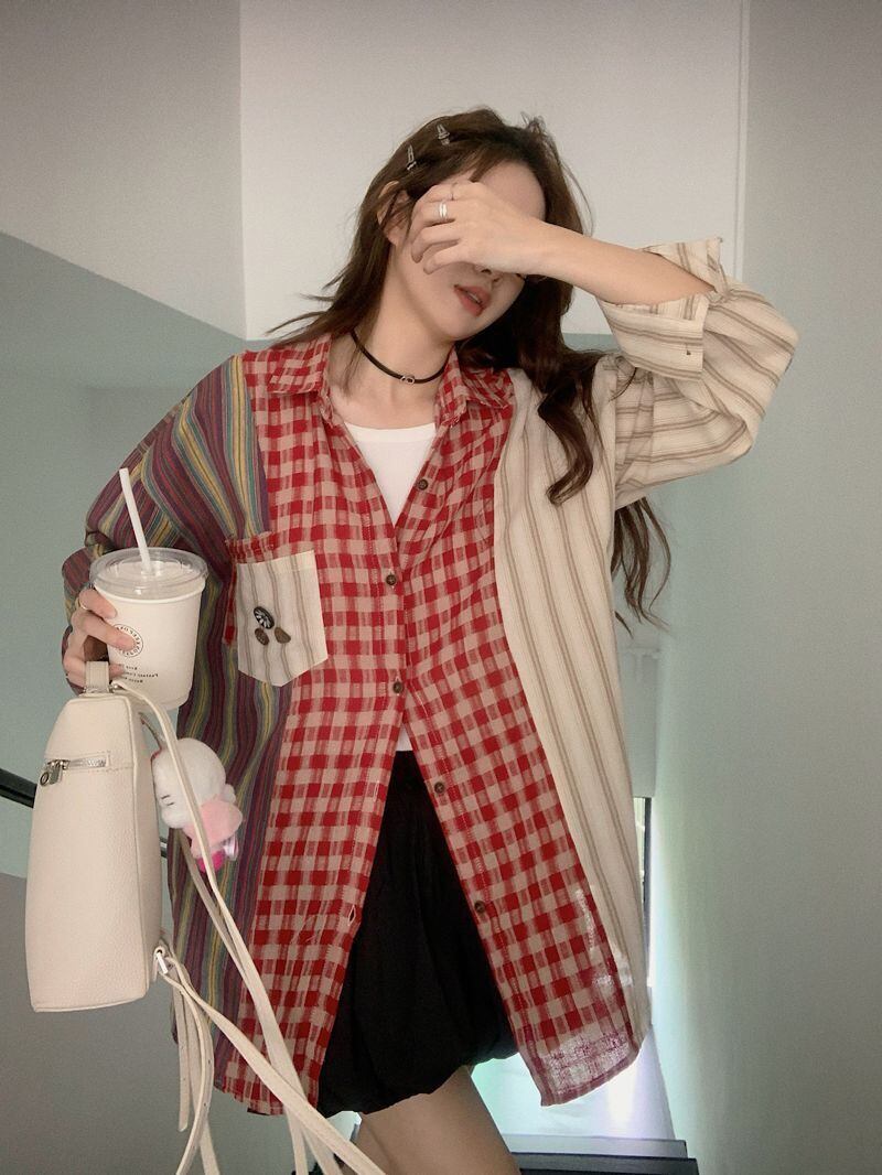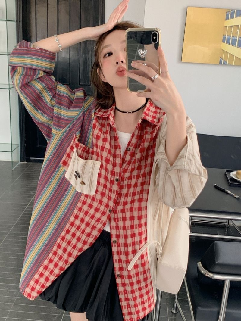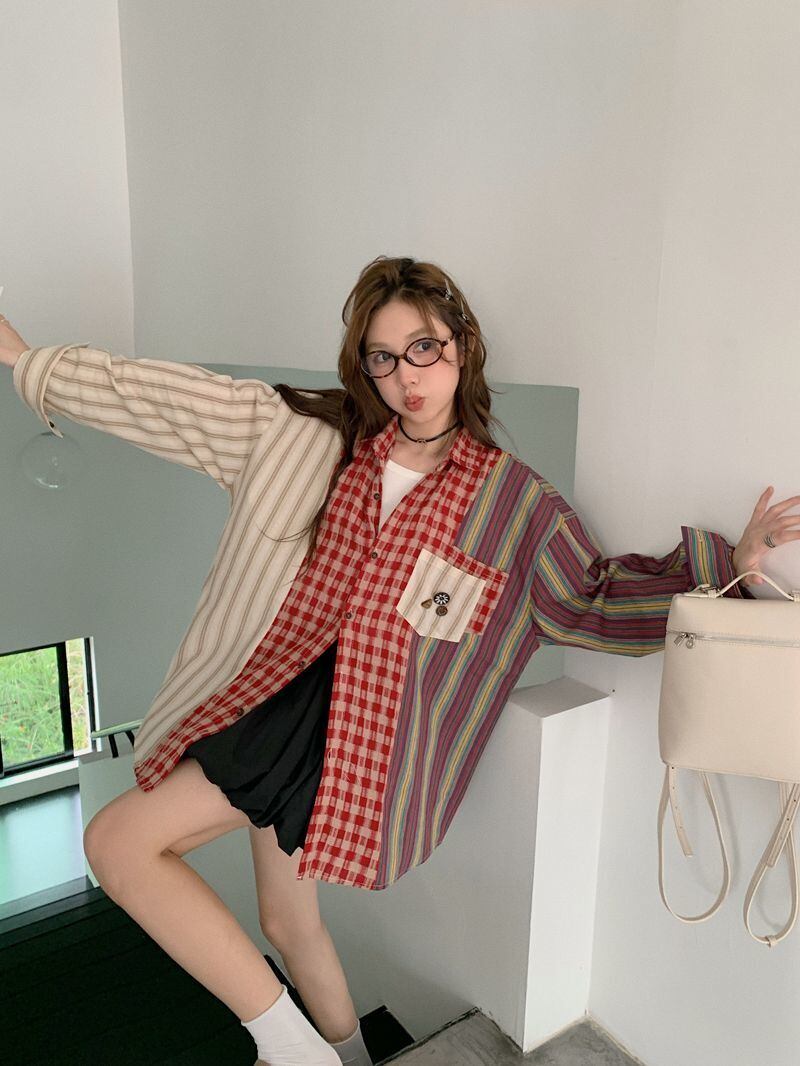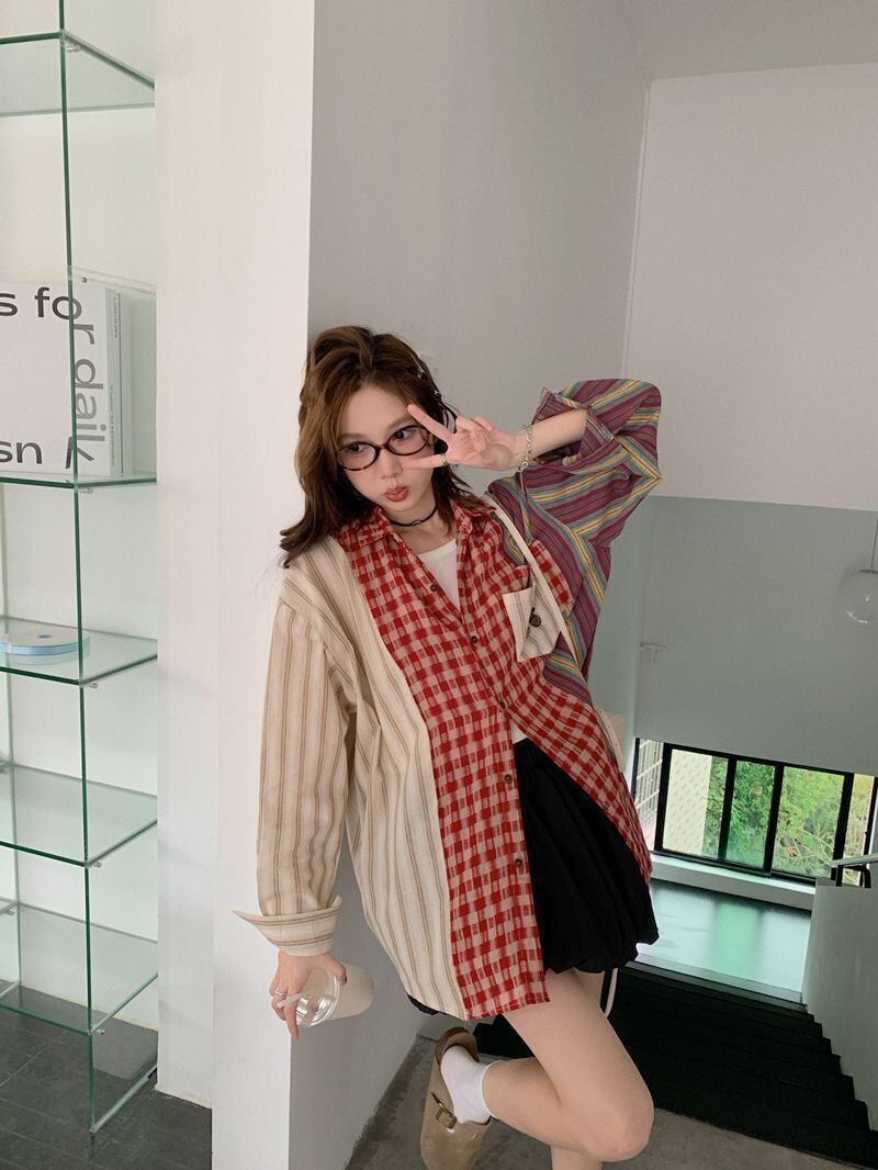 新商品 切り替え 個性的なデザイン チェック柄 ストライプ柄 シャツ E-9155