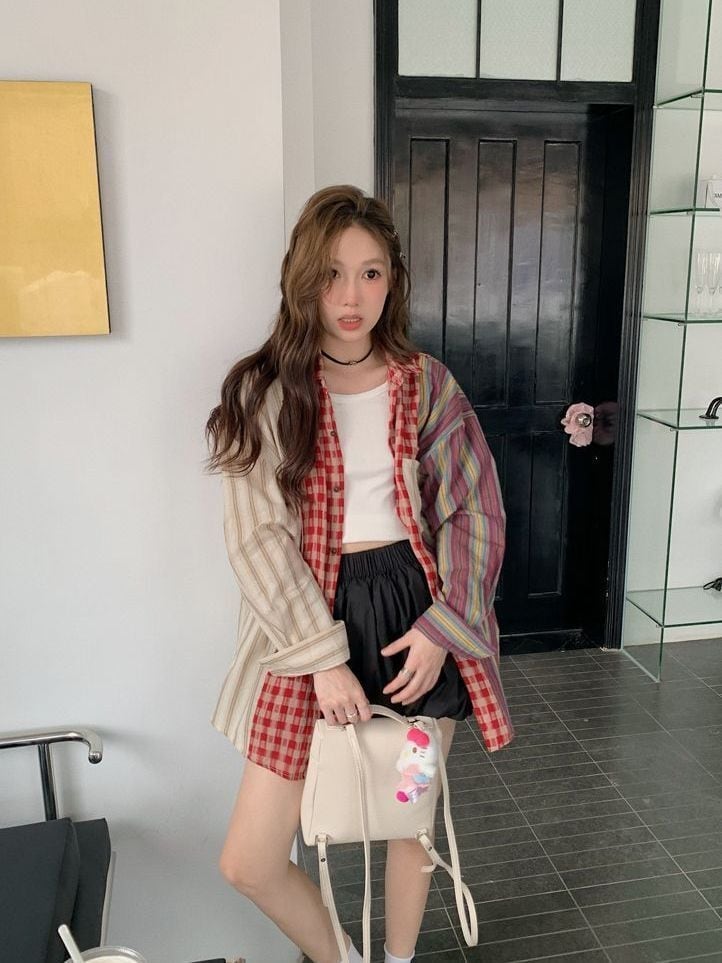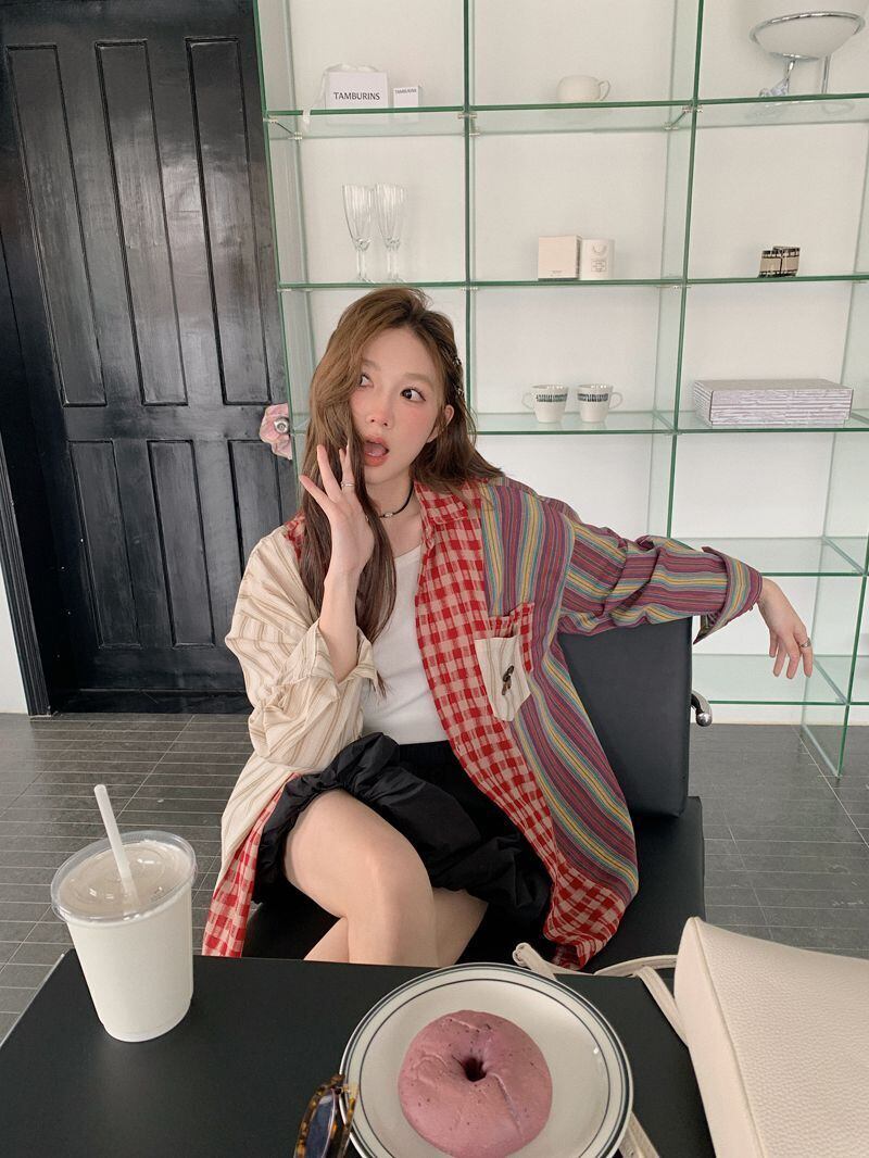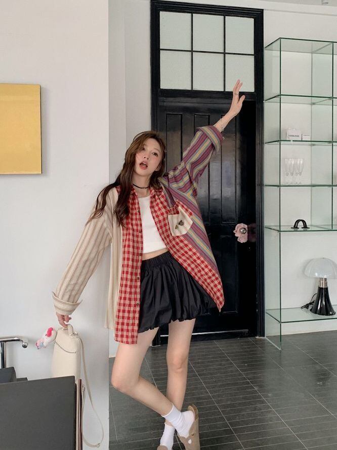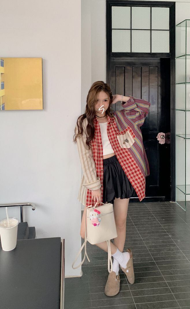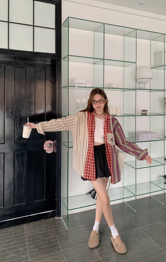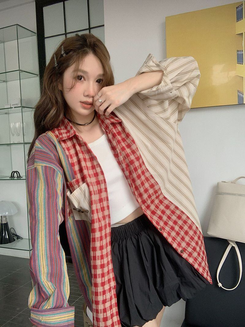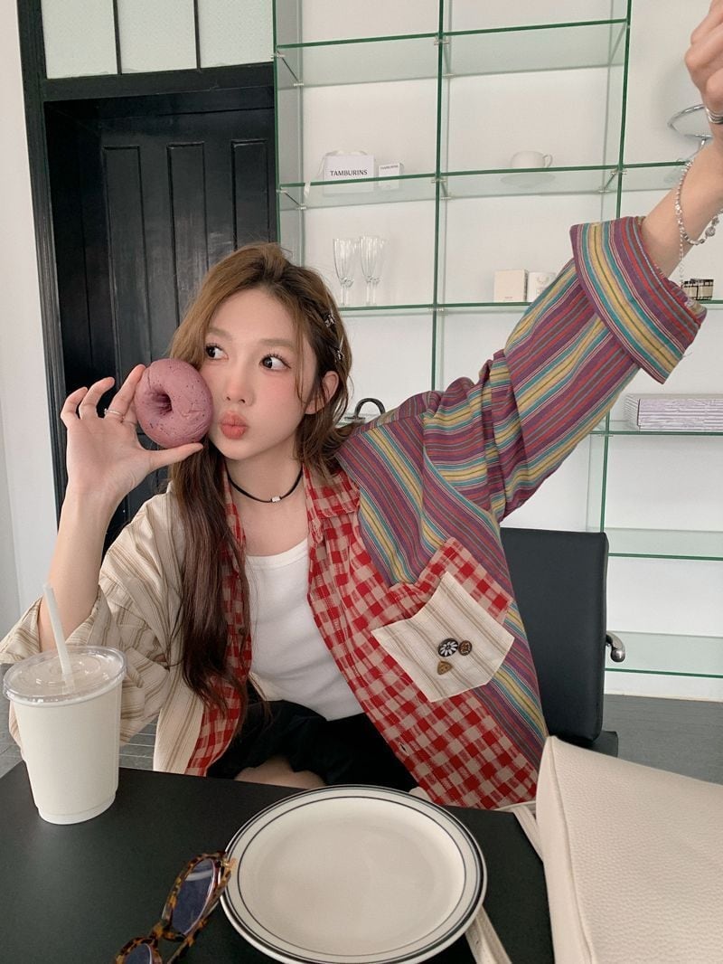 新商品 切り替え 個性的なデザイン チェック柄 ストライプ柄 シャツ E-9155
