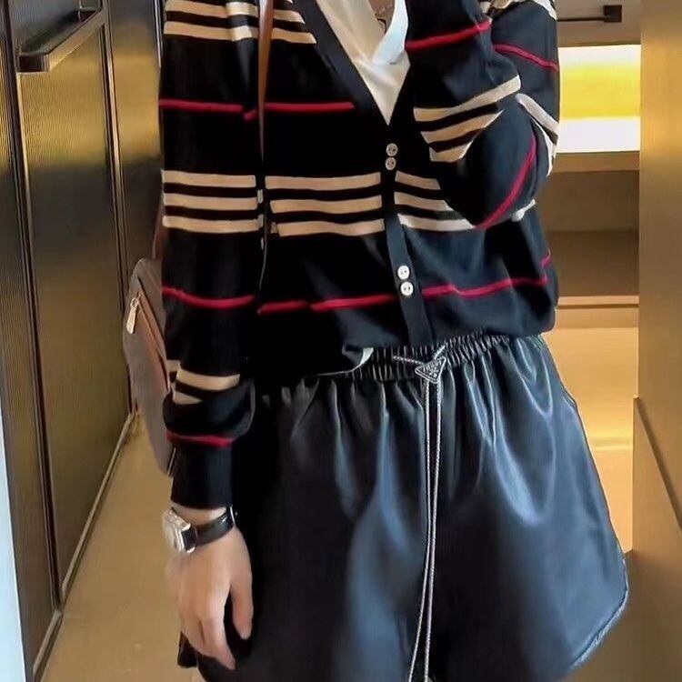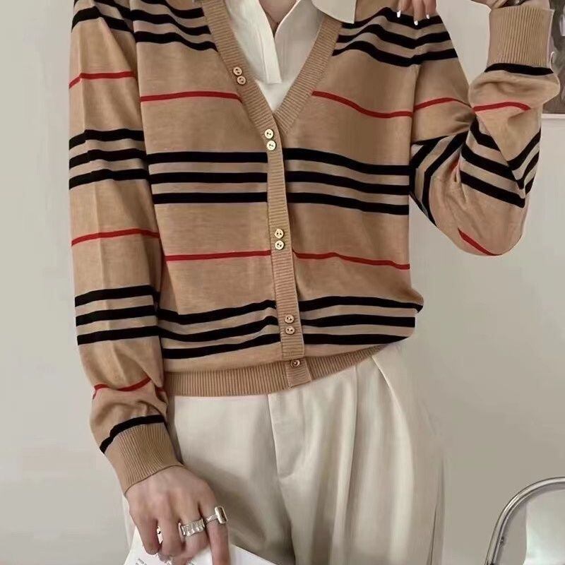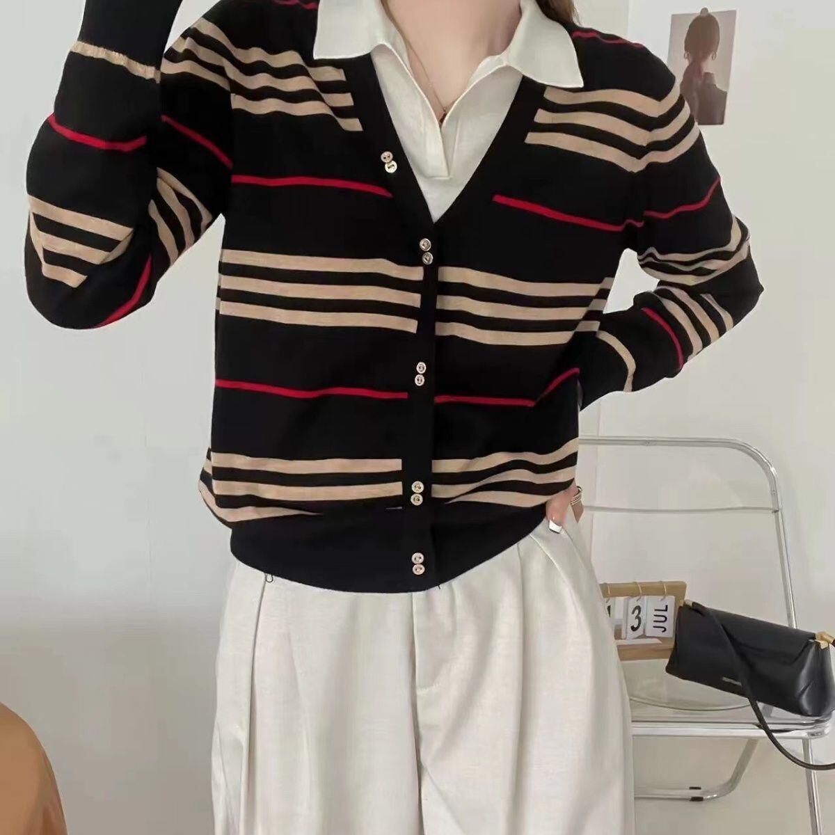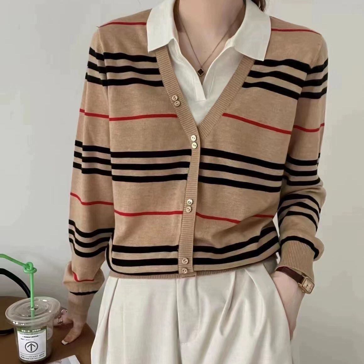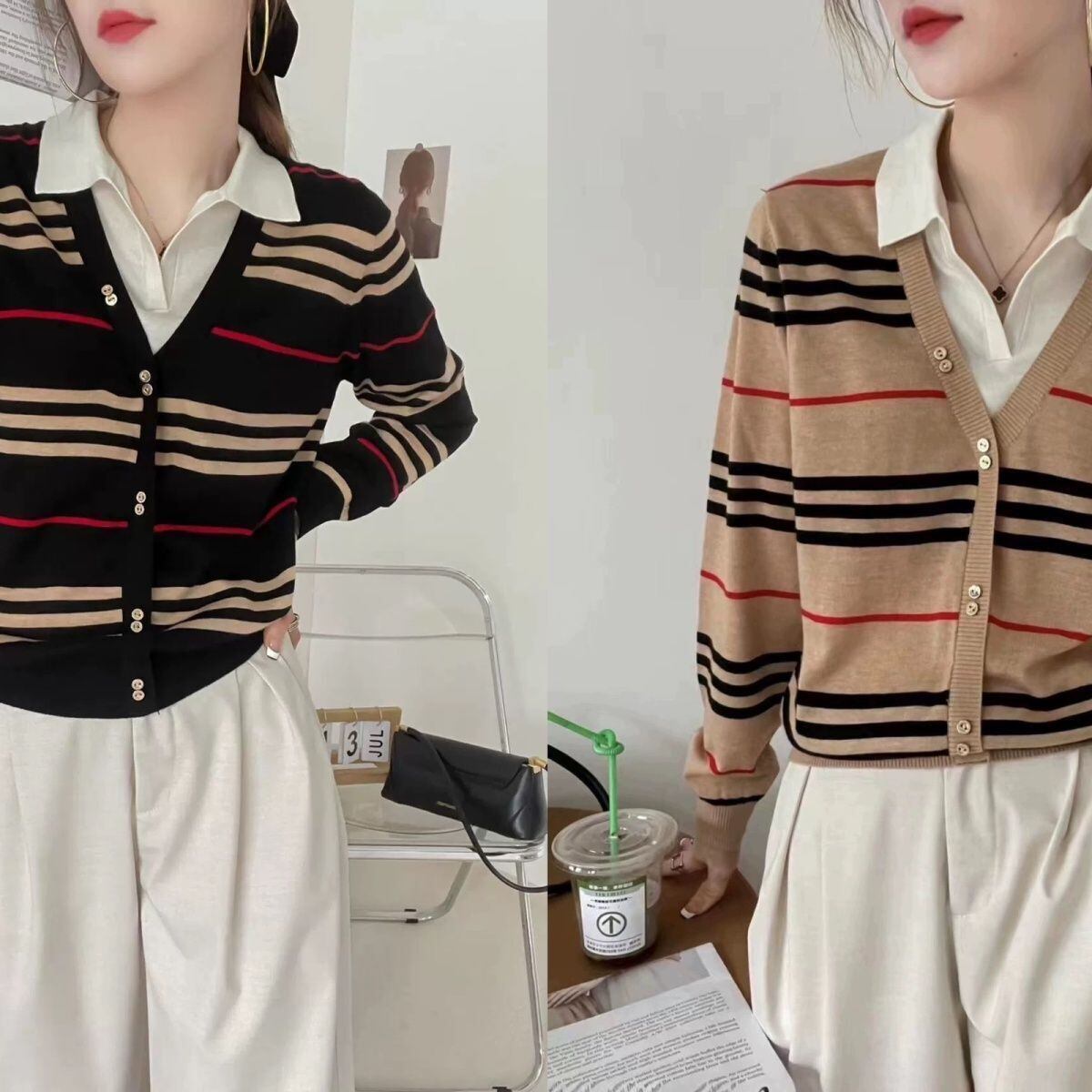 早い者勝ち 定番シンプル 好感度UP レイヤード風 ストライプ柄 2色選択 ニットトップスE-9575