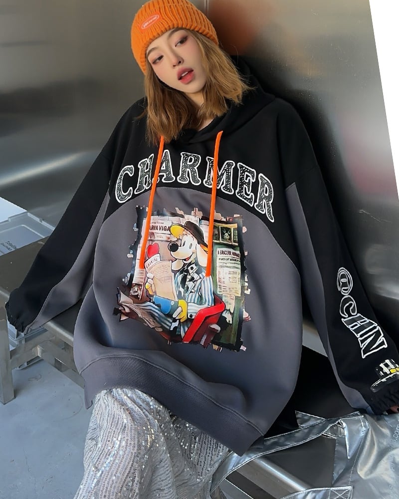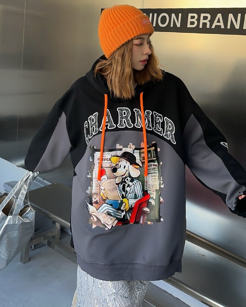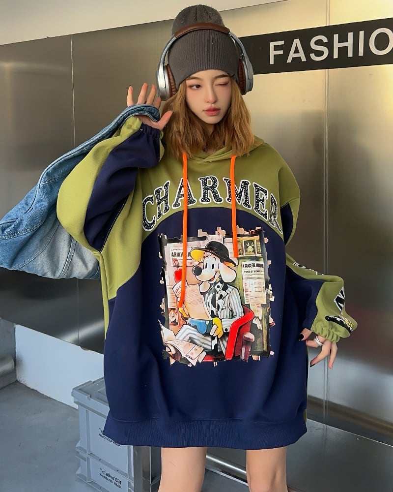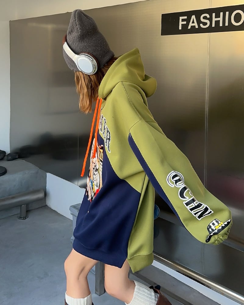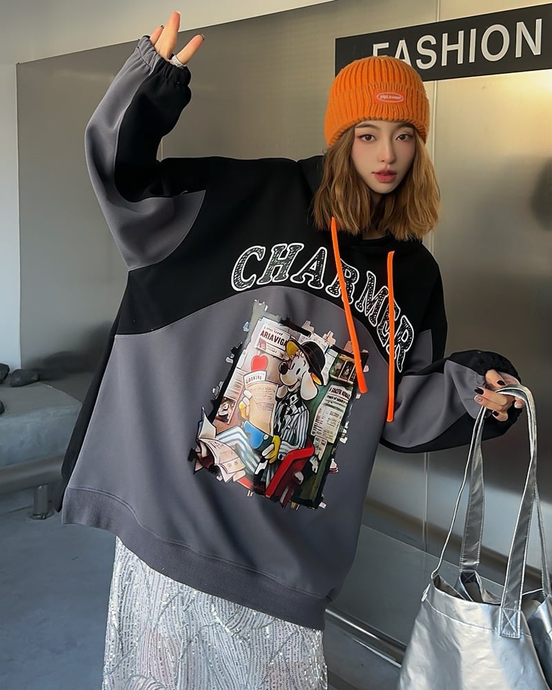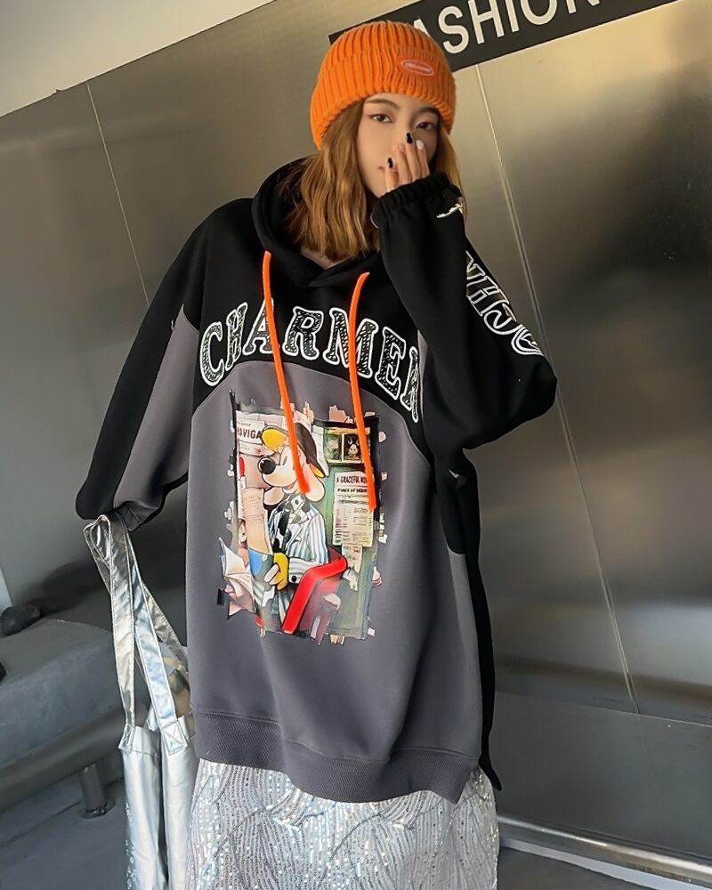 最新作プリントロゴ切り替えフード付きパーカ全3色オーバーサイズトップスins-4790