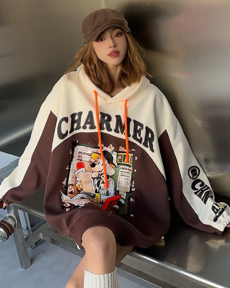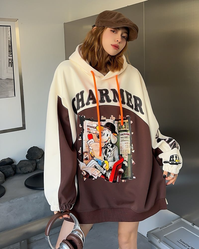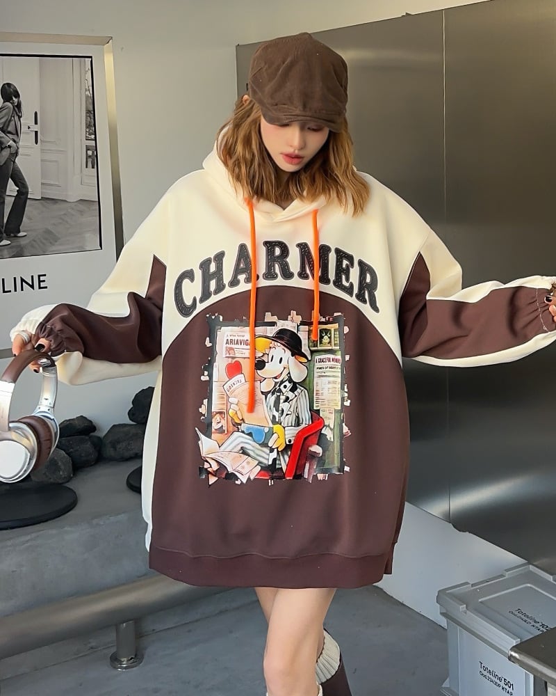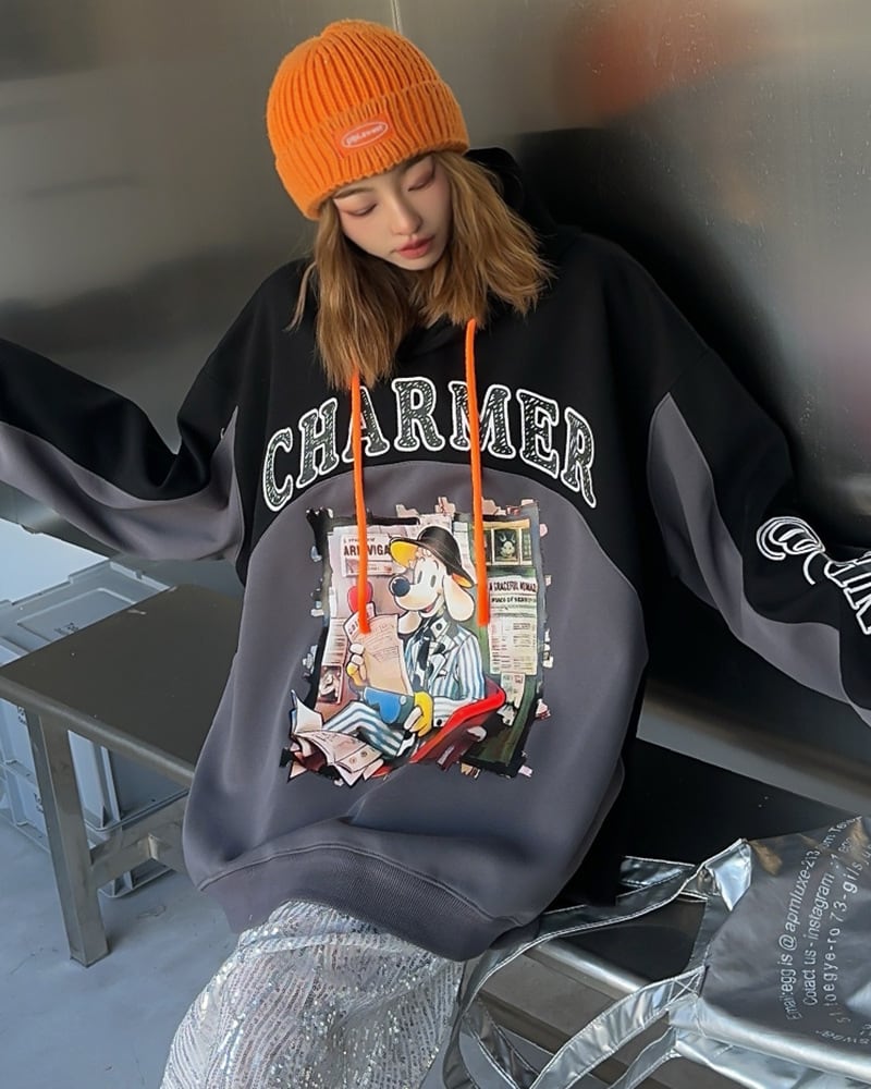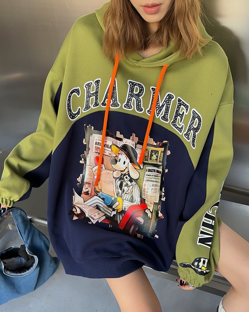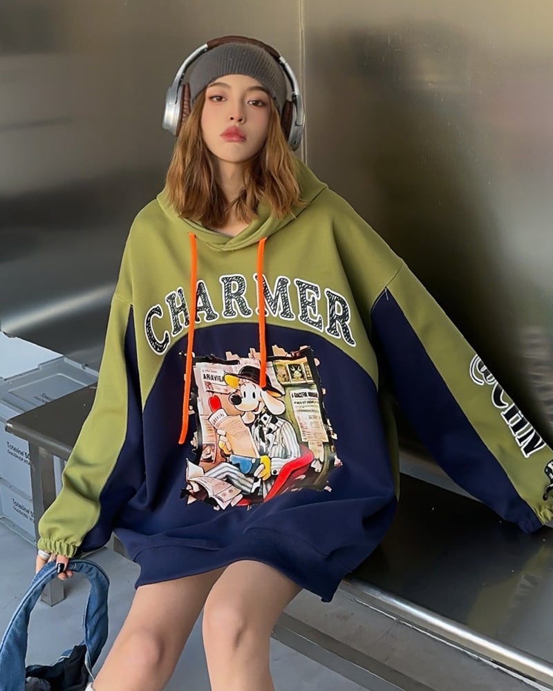 最新作プリントロゴ切り替えフード付きパーカ全3色オーバーサイズトップスins-4790