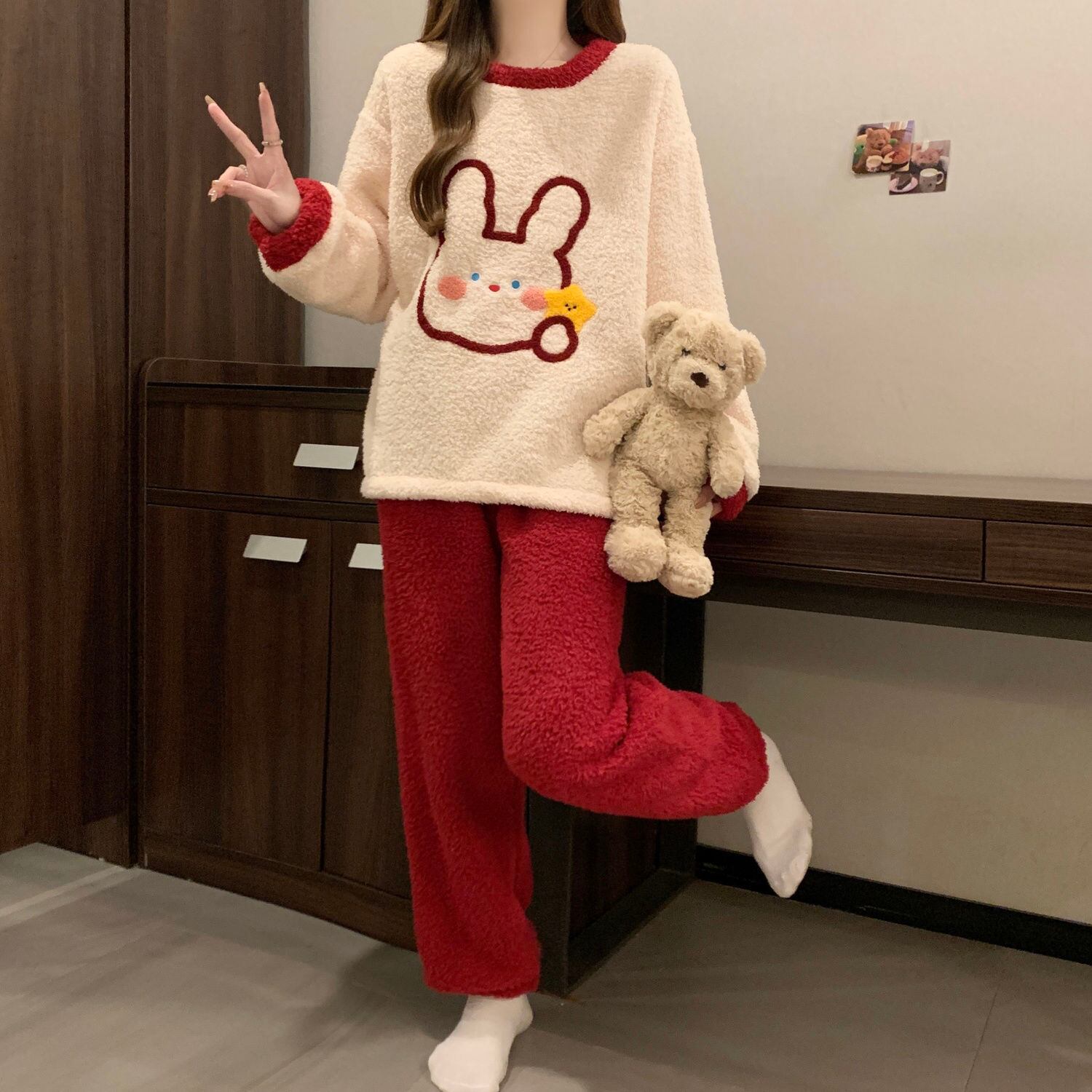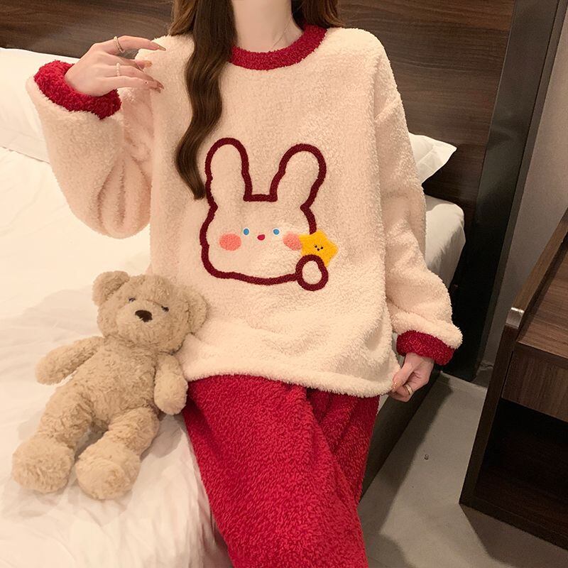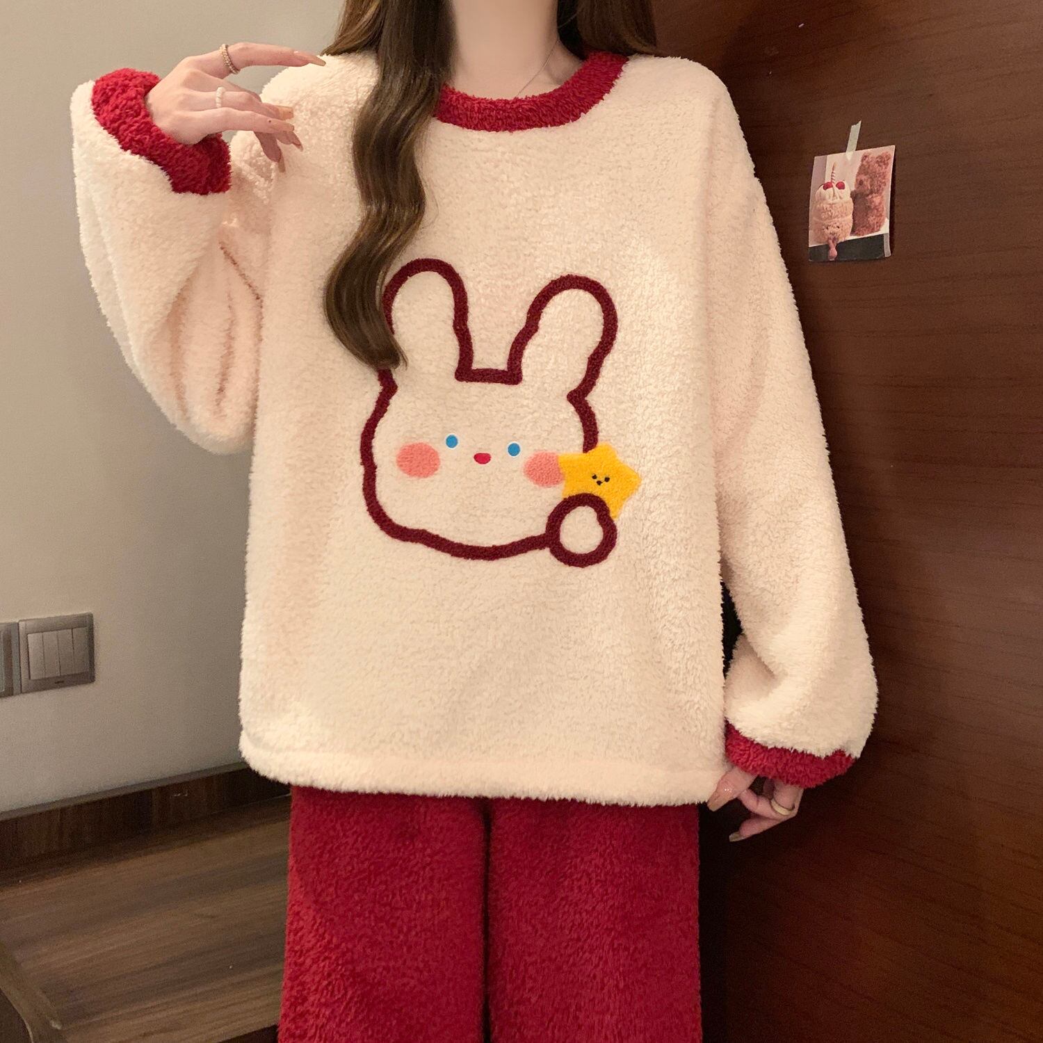 柔らかな肌触りで着心地も楽ちん!モコモコ ルームウェア 全3色 パジャマ 上下セットE-10337