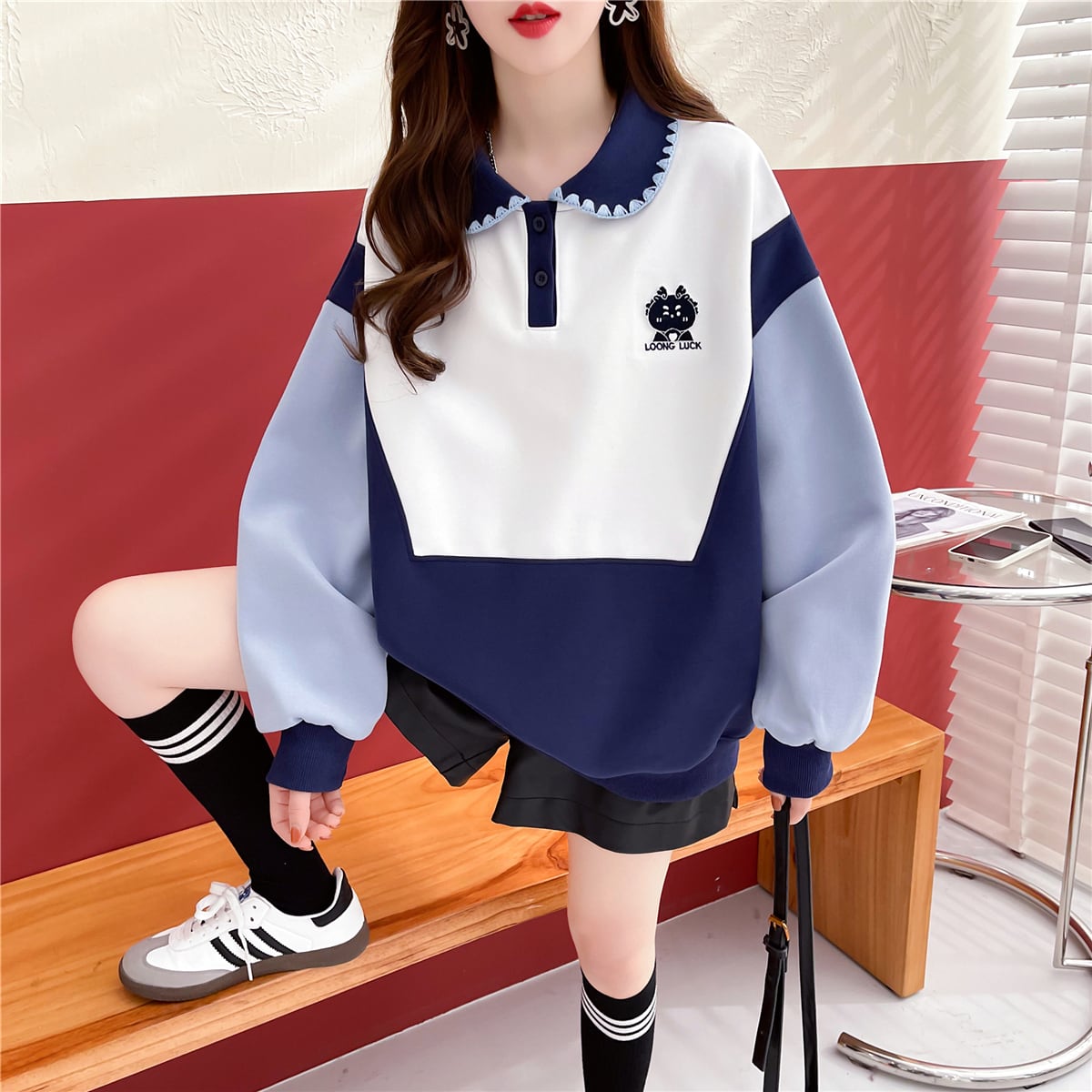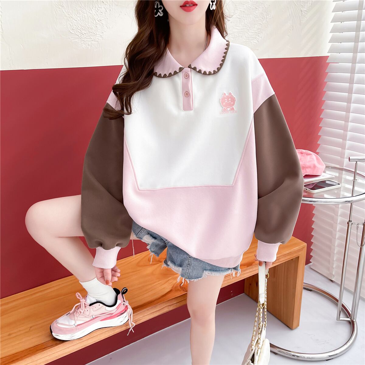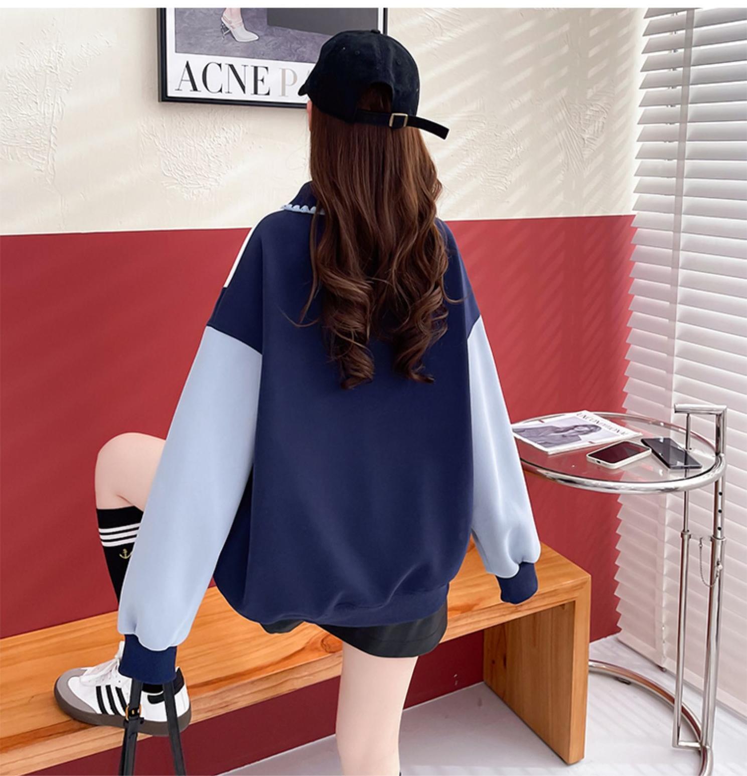 話題沸騰中カラーマッチング 切り替え 折り襟 ゆったりスウェット全2色トップスins-4783
