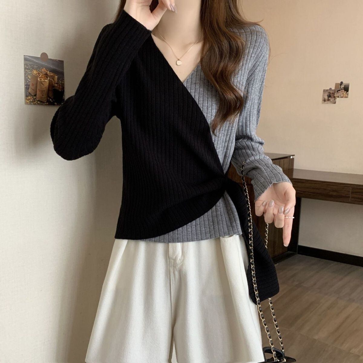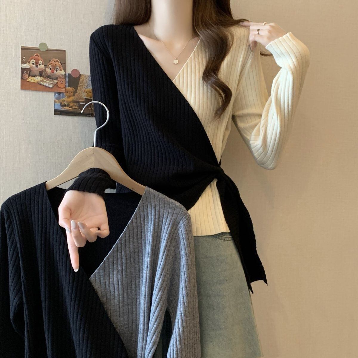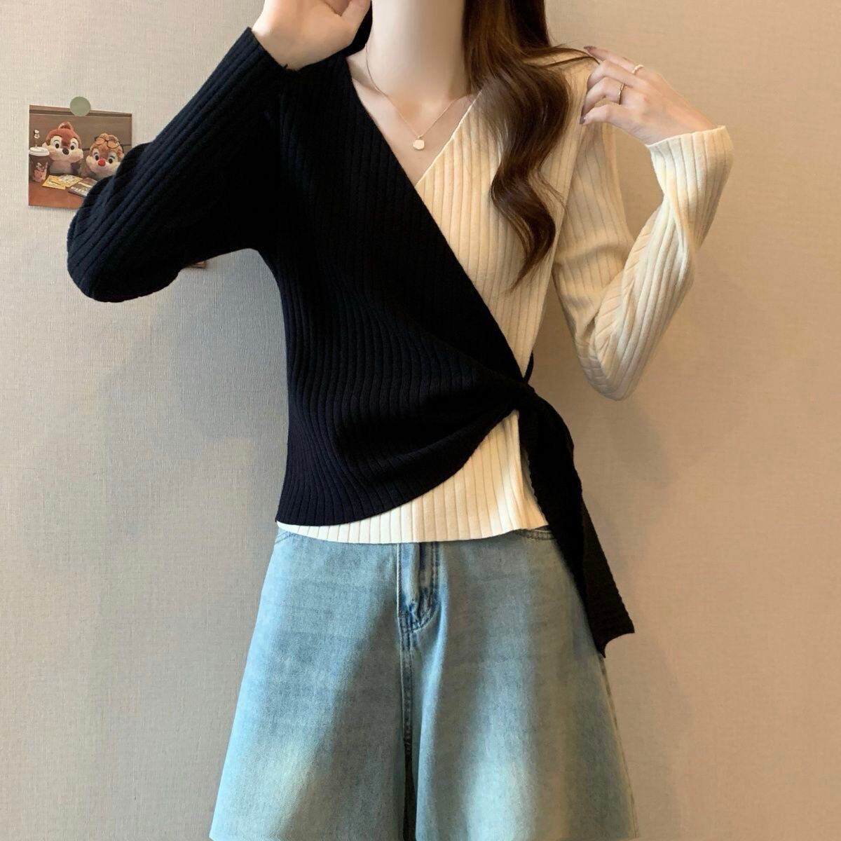 都市ファッショ デザイン オシャレ 個性的なデザイン 切り替え 2色選択 ニットトップスE-9574