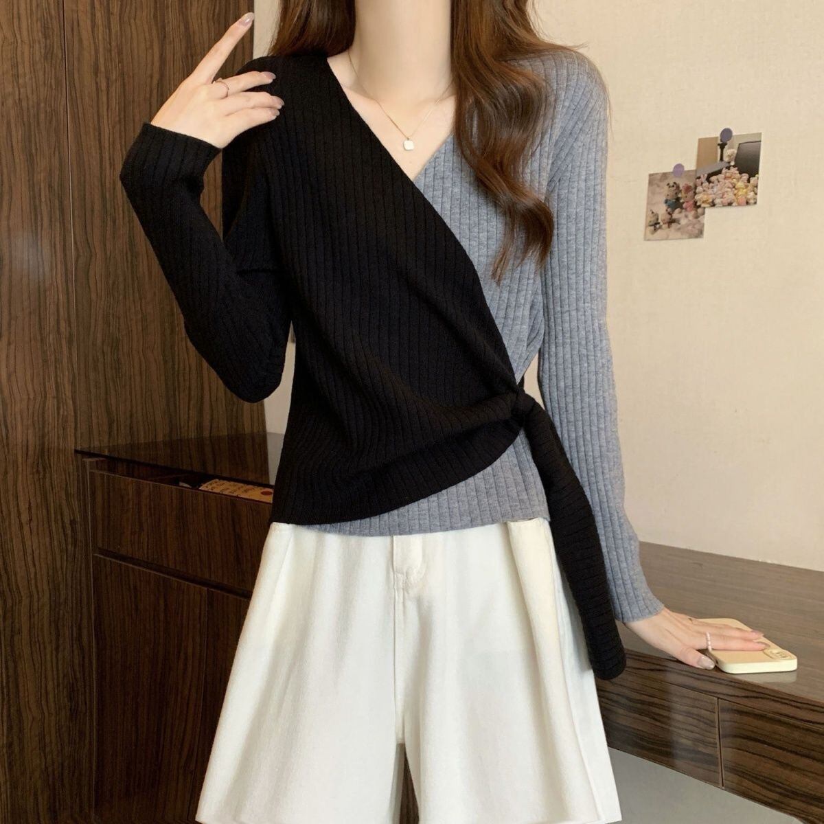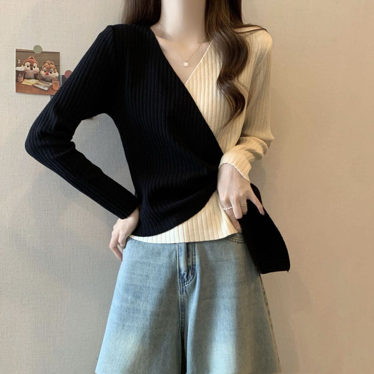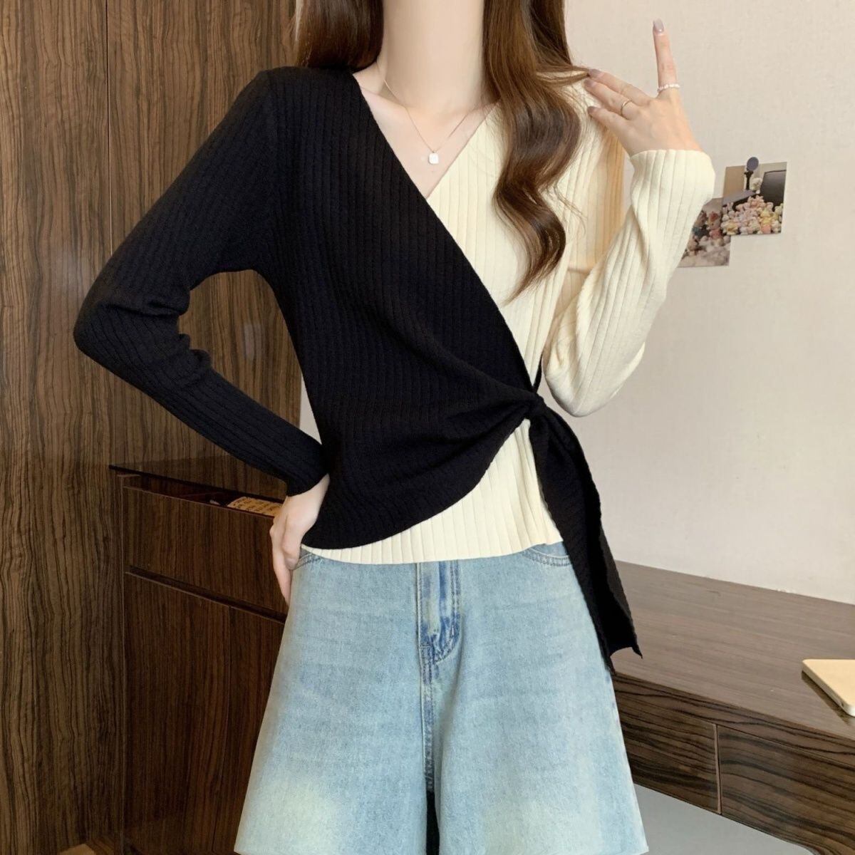 都市ファッショ デザイン オシャレ 個性的なデザイン 切り替え 2色選択 ニットトップスE-9574
