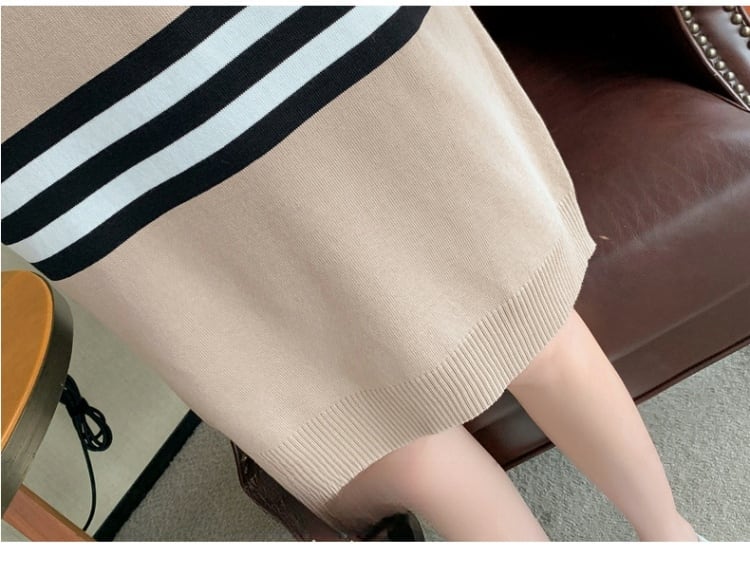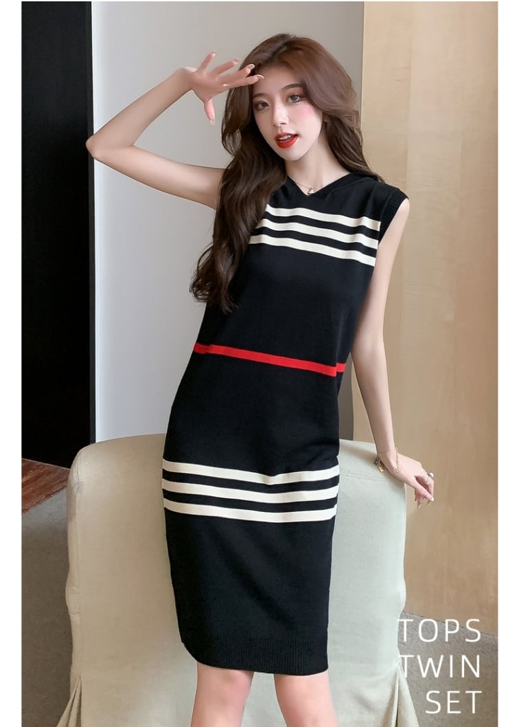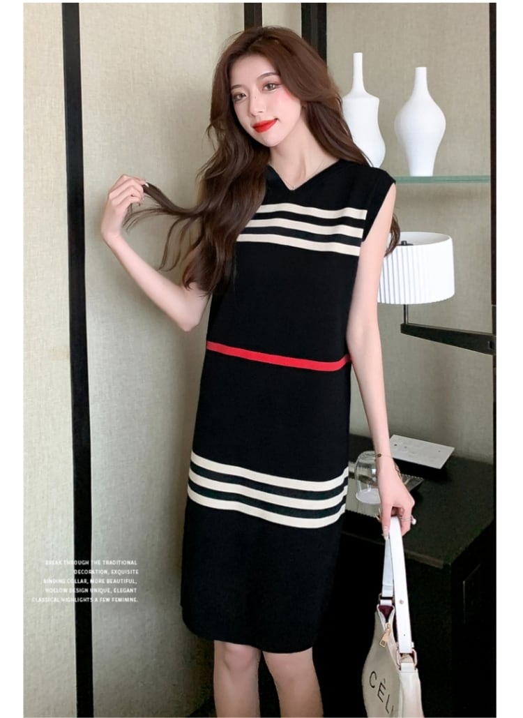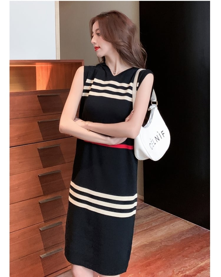 【半額!期間限定!!】大好評 カジュアル ストライプ柄 ノースリーブ ニットワンピース<ins-8445>