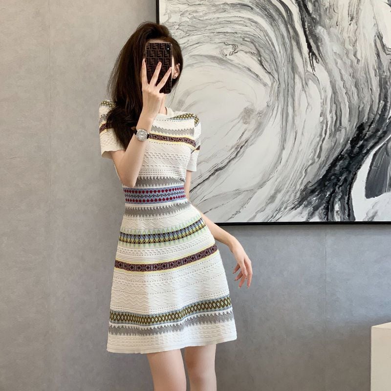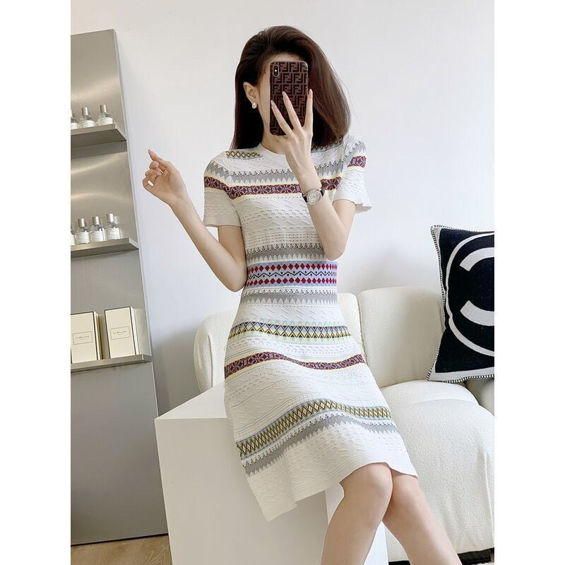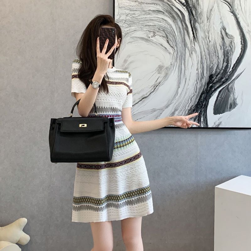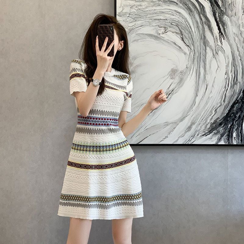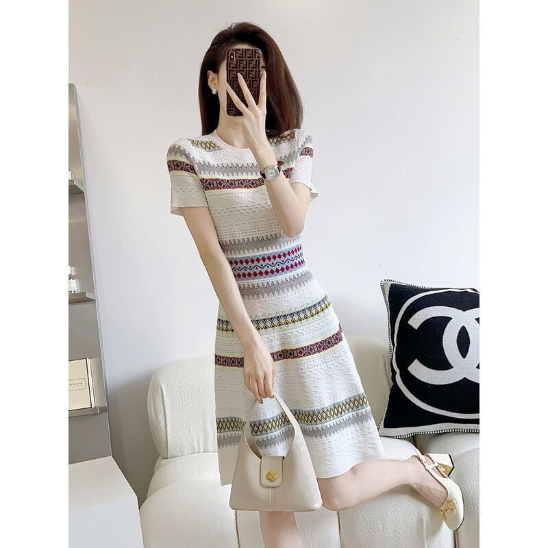 【半額!期間限定!!】話題沸騰中 上質 エレガント 知的 Aライン ストライプ柄 ニットワンピース<ins-8485>
