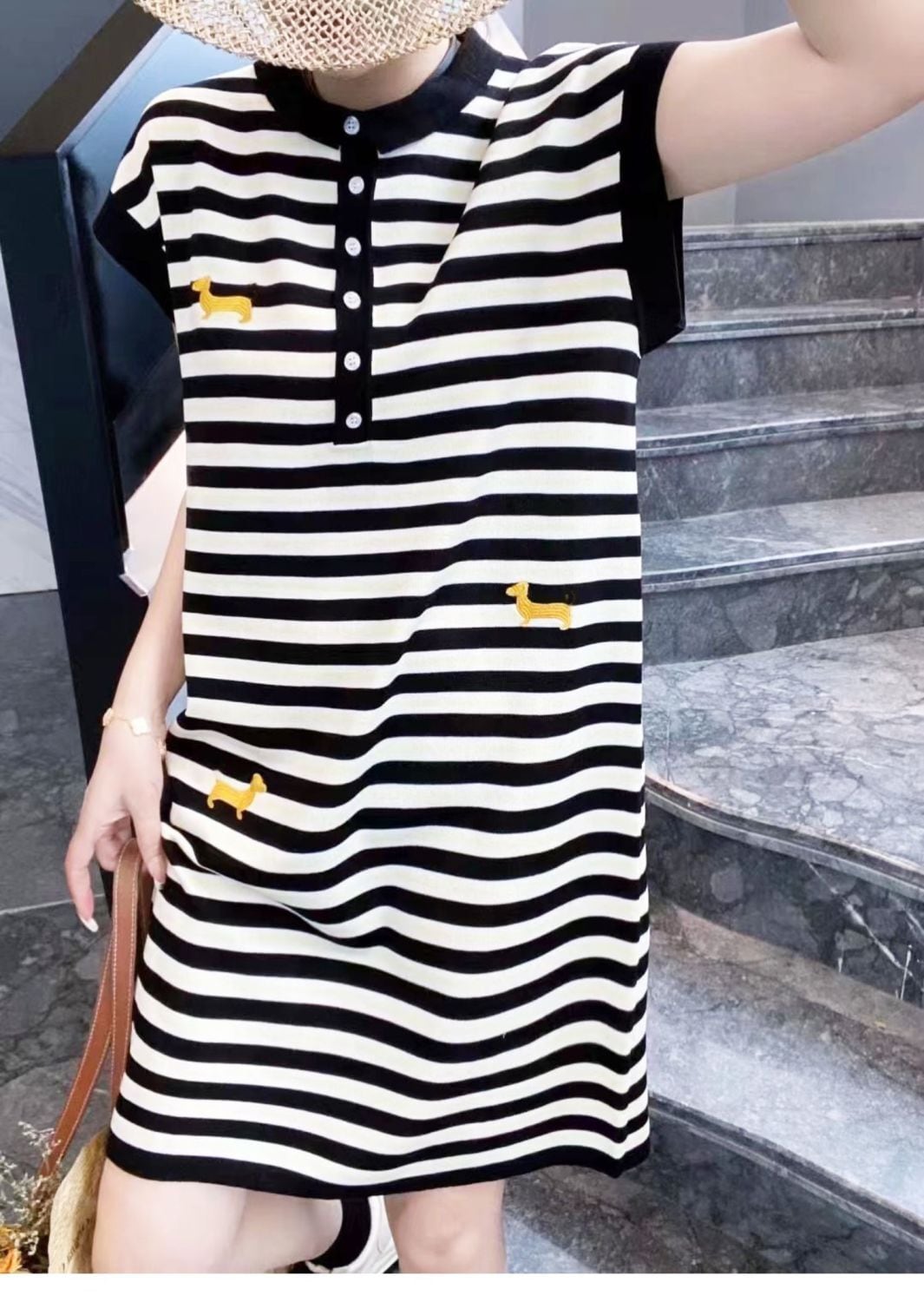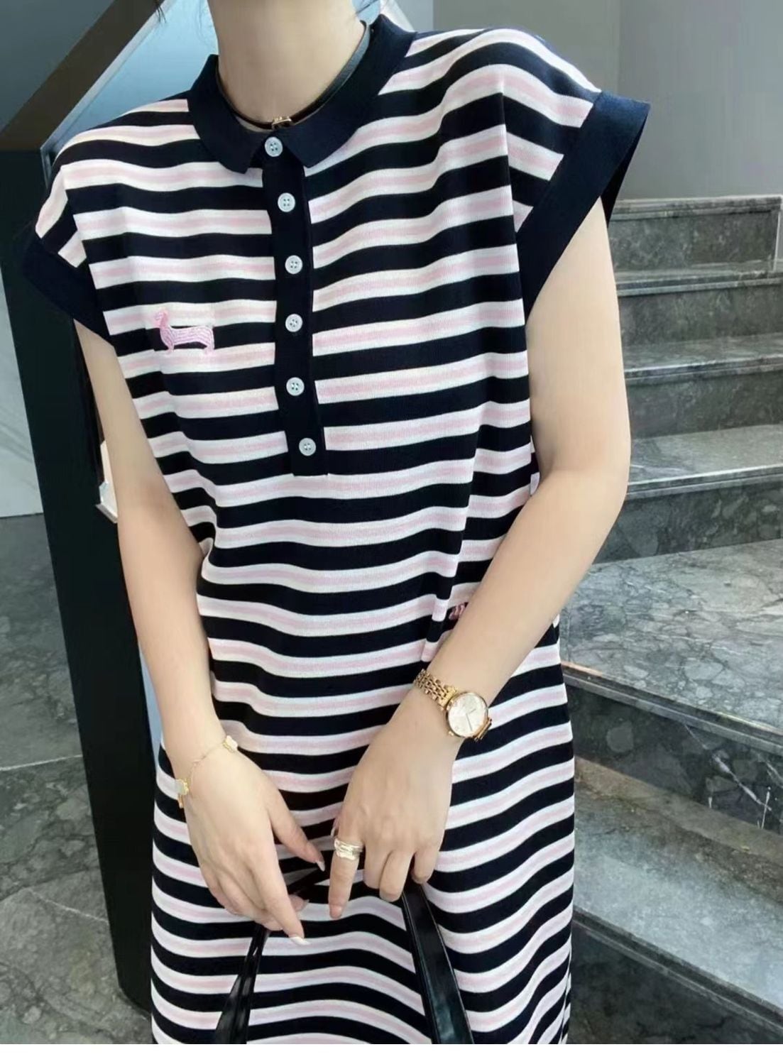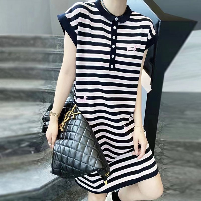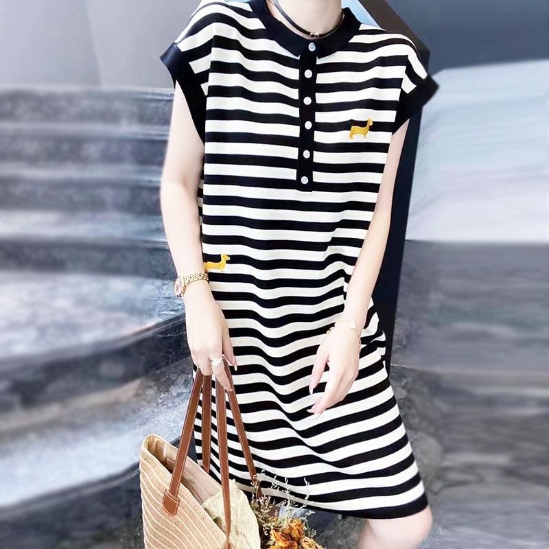 期間限定 カジュアル ストライプ柄 刺繍ノースリーブアイス シルクニットワンピース<ins-8501>