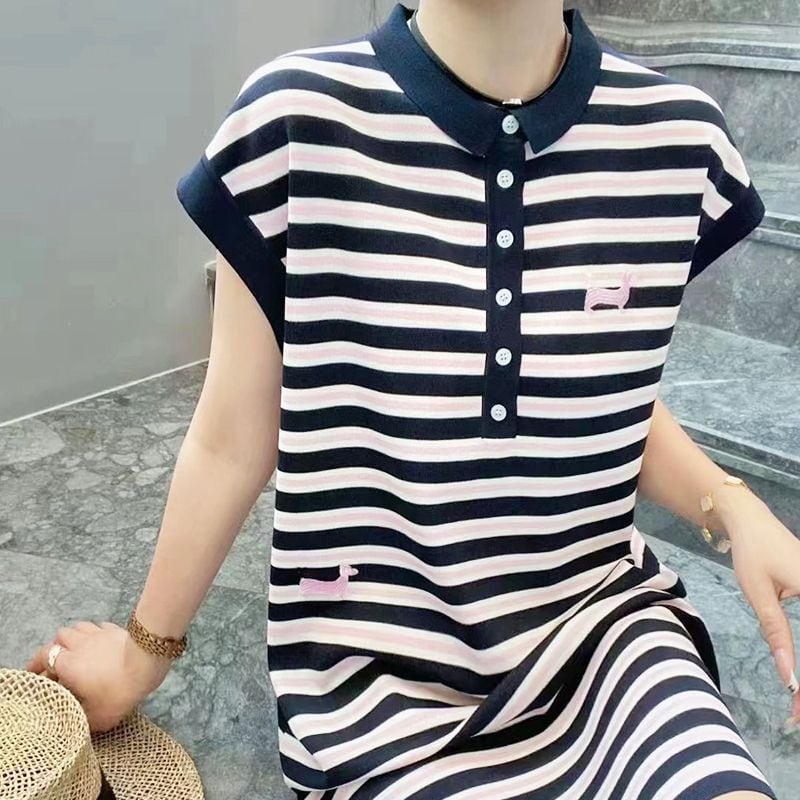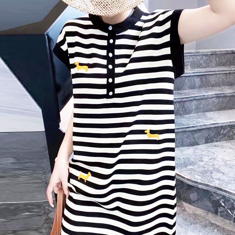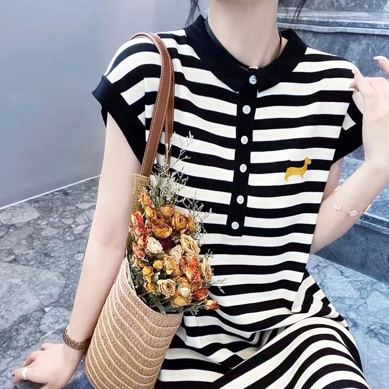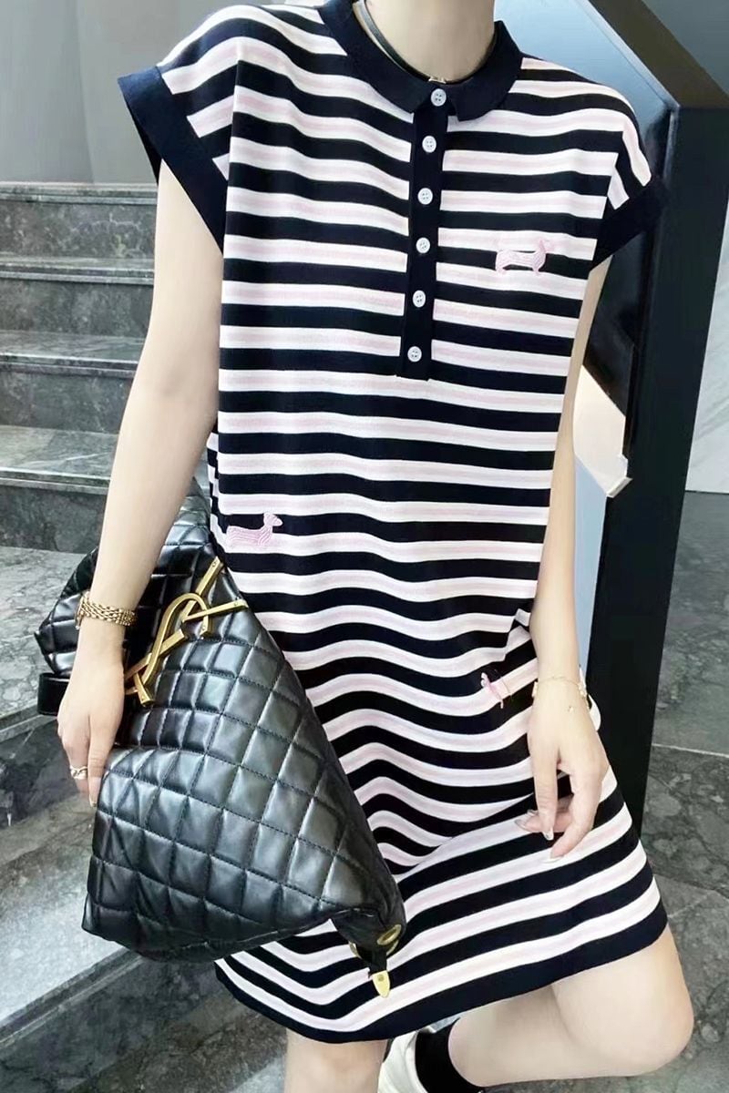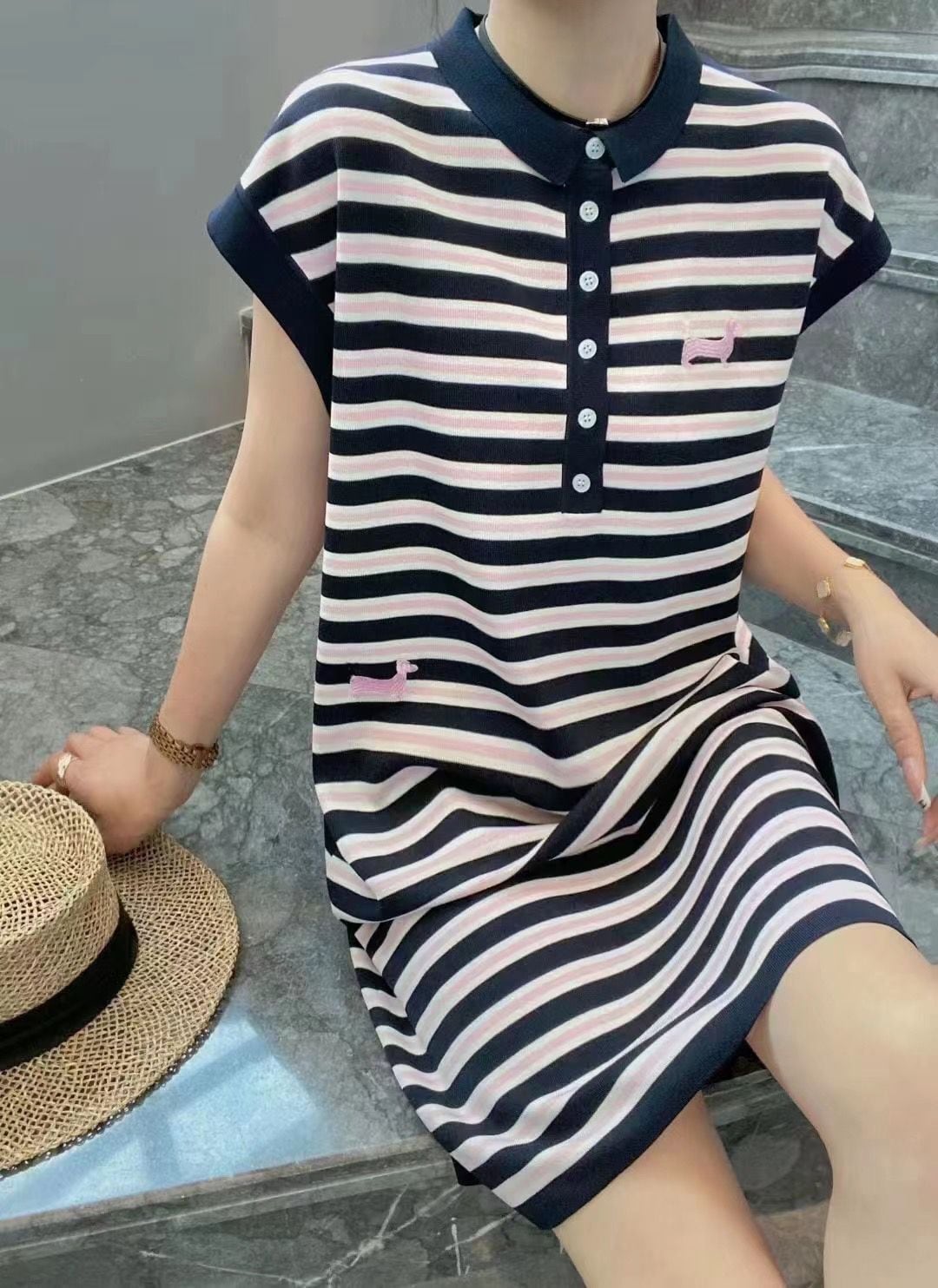 期間限定 カジュアル ストライプ柄 刺繍ノースリーブアイス シルクニットワンピース<ins-8501>